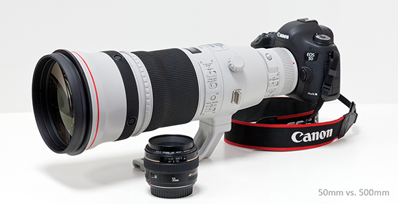Bij een lens met een brandpunt van 500mm op een volbeeldcamera (EOS 1DX of EOS 5D mark III) vult een olifant op een afstand van 100 meter ruim 2/3 van de breedte van het kader. Net zoals een zeemeeuw op 10 meter van de camera. Zijn deze werkafstanden te klein, dan kun je een 500mm-lens ook op een APS-H camera zetten (EOS 1D mark IV) en krijg je een zoekerbeeld overeenkomstig een lens met een brandpunt van 650mm op volbeeld (=1,3x) . Gebruik je een camera met APS-C sensor (EOS 7D), dan wordt de beeldhoek van een 500mm nog verder verkleind tot die van een 800mm op een volbeeldsensor (=1,6x). Dankzij deze cropfactor haal je het onderwerp dichterbij zonder dat je lichtsterkte kwijtraakt. Bovendien gebruik je de centrumscherpte van de lens en zullen zaken als hoekonscherpte en vignettering van een EF 500mm op een EOS 7D niet aanwezig zijn. Daarom wordt deze combinatie - eventueel aangevuld met een extender - veel gebruikt door vogelfotografen. Want dankzij zijn f/4 lichtsterkte kun je op deze 500mm ook nog zonder veel problemen een 1.4x extender gebruiken en zo de beeldhoek verkleinen tot die van een lens met een brandpunt van 700mm (1120mm EOS 7D). Je levert dan één stop lichtsterkte in (max. f/5.6), maar met een EF 1.4x mark III zul je nauwelijks scherpte verliezen. Theoretisch zou je ook nog een EF 2x mark III op een EF 500mm f/4 kunnen zetten, waardoor deze 1000mm en f/8 wordt, maar dan werkt de autofocus niet meer. Misschien dat dit opgelost wordt met nieuwe firmware op de EOS 1DX en EOS 5D mark III.