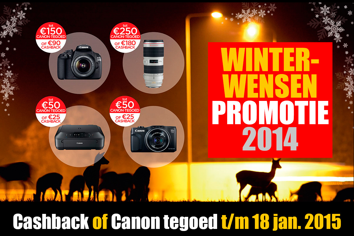 De campagne wordt ondersteund met de promotie ‘WinterWensen’. Schaf tussen 30 oktober 2014 en 18 januari 2015 één of meerdere actieproducten aan en krijg tot € 180 cashback retour of ontvang tot € 250 Canon-tegoed op maar liefst 30 producten.