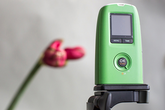 Dat klinkt natuurlijk allemaal heel eenvoudig, maar de praktijk moet bewijzen of dat ook echt het geval is. Wij hebben een amaryllis in knop binnen bij een raam gezet. Als achtergrond hebben we een lichtgrijs karton gekozen. Bij een zwarte achtergrond zorgde de automatische belichting voor overbelichting van de bloem. Een witte achtergrond had het omgekeerde effect. De TLC200 kent geen belichtingscompensatie om dit te voorkomen, dus moest de achtergrond middengrijs zijn.