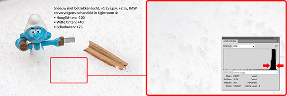 Als je dus van dichtbij met strijklicht sneeuw fotografeert, dan krijg je met de juiste hoeveelheid positieve belichtingscompensatie én de juiste helderheid én voldoende structuur. Aanpassing in Photoshop of Lightroom van plaats en breedte van de sneeuwpiek in het histogram is dan zelden nodig.