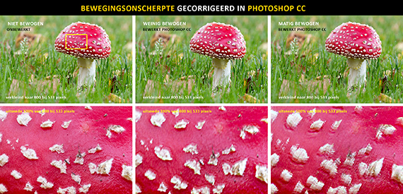 In Photoshop CC is het filter Schokreductie geïntroduceerd en doet wat het beloofd: het ‘terugzetten’ van verschoven pixels zodat een bewogen foto weer detail terugkrijgt en dus scherper wordt. In het dialoogvenster van Schokreductie kunnen een paar variabelen worden ingesteld, waaronder het gebied waar de beweging wordt geanalyseerd, hoeveel pixels het bewegingsspoor moet worden gevolgd, hoe met ruis omgegaan moet worden (heeft geen bewegingsspoor) en hoe artefacten (foute pixels) van JPEG moet worden genegeerd. Je komt met een paar kleine aanpassingen snel tot een redelijk goed resultaat, mits de foto niet teveel bewogen is. Na behandeling met Schokreductie is de foto inderdaad visueel scherper, pixels zijn minder ‘uitgesmeerd’. Kijk je op 25% van het totale beeld, dan is het bijna een wonder dat zich heeft voltrokken. De foto lijkt weer haarscherp. Bij 100% zie je echter dat het ‘herstel’ niet helemaal netjes gebeurd is, maar gezien de geringe moeite van het toepassen van dit nieuwe filter is het altijd een poging waard om een verloren gewaande foto alsnog te kunnen redden.
