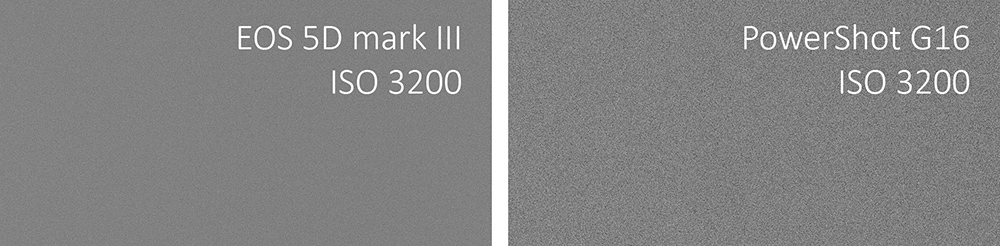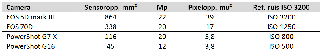 We hebben het pixeloppervlak van verschillende sensorformaten eens op een rijtje gezet en van vier camera’s ook de hoeveelheid ruis gemeten. De veronderstelling dat kleinere ‘pixels’ meer ruis geven bij hogere ISO’s, wordt hierbij bevestigd, waarbij de verschillen significant zijn. De hoeveelheid ruis bij ISO 3200 op een volbeeldsensor (EOS 5D mark III) zie je bij een EOS 70D met een APS-C sensor al bij ISO 1250. Dat is 1 1/3 stop verschil. Dat verschil wordt zelfs 2 stops op een 1-inch sensor (PowerShot G7X), waarbij we die ruis bij ISO 800 meten. Wordt het pixeloppervlak nog kleiner (PowerShot G16), dan is bij ISO 500 de hoeveelheid ruis hetzelfde als bij ISO 3200 op een volbeeldcamera. Dat is 2 2/3 stop.