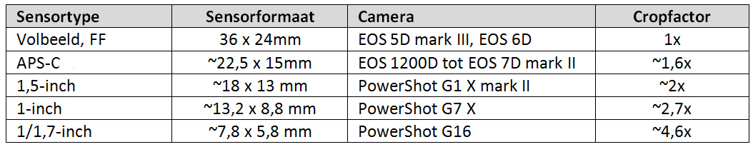 In de tabel hebben we ook een kolom Cropfactor opgenomen. Deze waarde is het quotiënt van de breedte van een volbeeldsensor en de breedte van de betreffende sensor en is de factor dat het brandpunt van de lens kleiner kan zijn om op een kleinere sensor toch dezelfde beeldhoek te hebben. Zo zit in de PowerShot G7 X een zoomlensje met een brandpuntbereik van 8,8 tot 36,8 mm en daarmee kun je een onderwerp hetzelfde kaderen als met een 24-100mm lens op een EOS 6D.