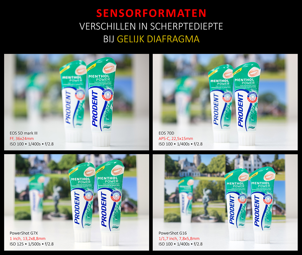 In de onderstaande afbeelding is te zien hoeveel kleiner het diafragma van camera’s met een grotere sensor moet worden om toch dezelfde scherptediepte te krijgen. Let ook op de gevolgen voor de sluitertijd.