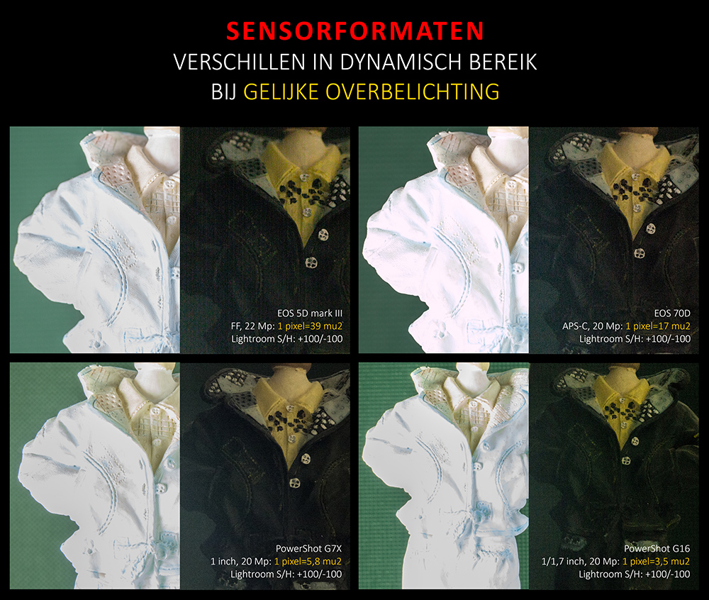 In de onderstaande afbeelding zijn de kleine verschillen in de hooglichten te zien. Het linkerbeeld is steeds één stop overbelicht geweest. Het beeld rechts stond bij dezelfde opname in het donker. In Lightroom hebben we gelijke opnamen van vier camera’s met een verschillend sensorformaat behandeld met Hooglichten: -100 en met Schaduwen: +100, waarvan hieronder het 100% resultaat. Zoom goed in om de verschillen te zien.