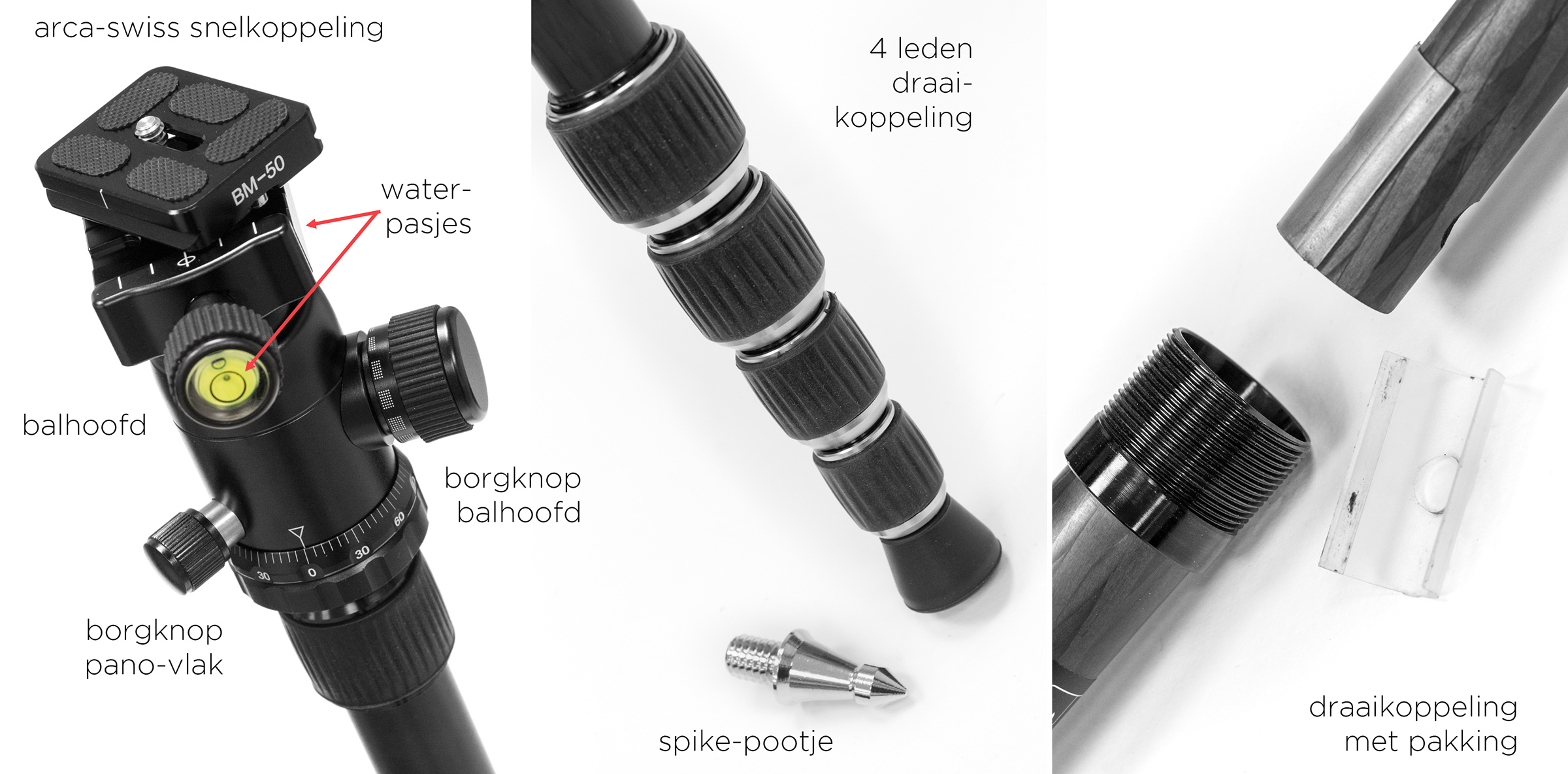 Het type en het principe van de meegeleverde statiefkop is bij alle vier statieven gelijk. Het is een balhoofd met twee borgingen en een snelkoppeling. De kleine borging zorgt voor het vastzetten van de horizontale draaibeweging van het gehele balhoofd en dus ideaal voor panorama’s of andere overlappende series. Er staat zelfs een gradenverdeling op. De tweede, grotere borging is die van het balhoofd. Het heeft een korte slag en vast is vast. Zowel het draaien van de gehele balhoofd als van het balhoofd zelf gebeurt gedempt en dat werkt bijzonder prettig. De statiefkop is voorzien van drie waterpasjes, die als indicatie van waterpas kunnen dienen. Wil je echter heel precies in het horizontale of verticale vlak werken, gebruik dan de elektronische waterpas in de camera zelf. De snelkoppeling is van het type ‘Arca Swiss’. Dat is heel algemeen en ruim verkrijgbaar. Omdat het plaatje iets naar voor en achter kan schuiven, kan het ook nog dienst doen als eenvoudige macroslede.