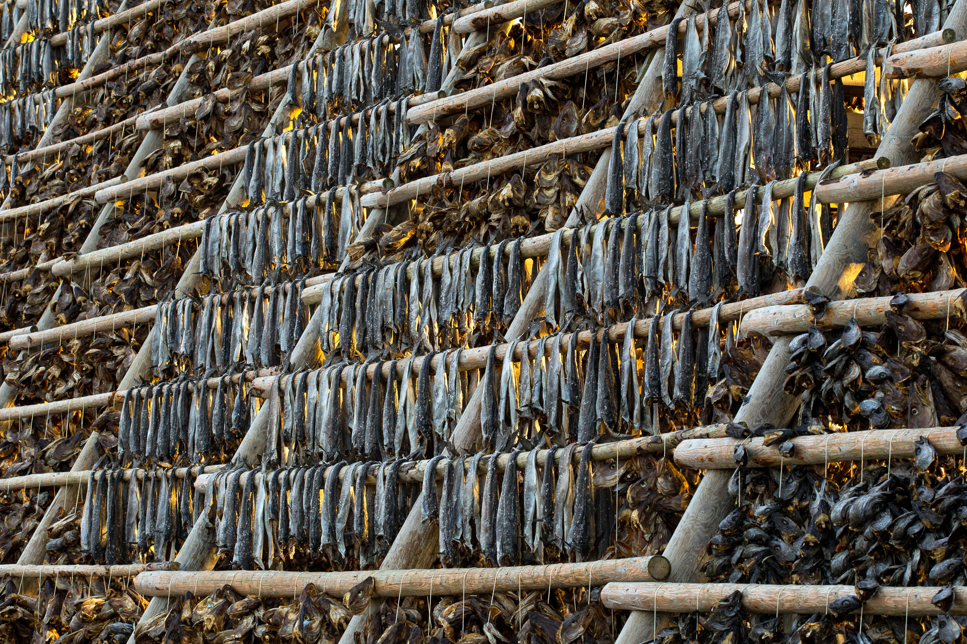 Drie maanden later worden ze er weer afgehaald en geëxporteerd. Onze smaak heeft het niet, maar het is wel een bijzonder gezicht. Het is wel even oppassen wanneer je dit fotografeert. Wanneer het niet vriest druppelt er van alles uit de hangende vissenlijven. De geur blijft je dan nog een lange tijd achtervolgen. De huisjes in de vissersdorpen zijn vaak een lust voor het oog. In het ruige landschap steken de felgekleurde huisjes mooi af.