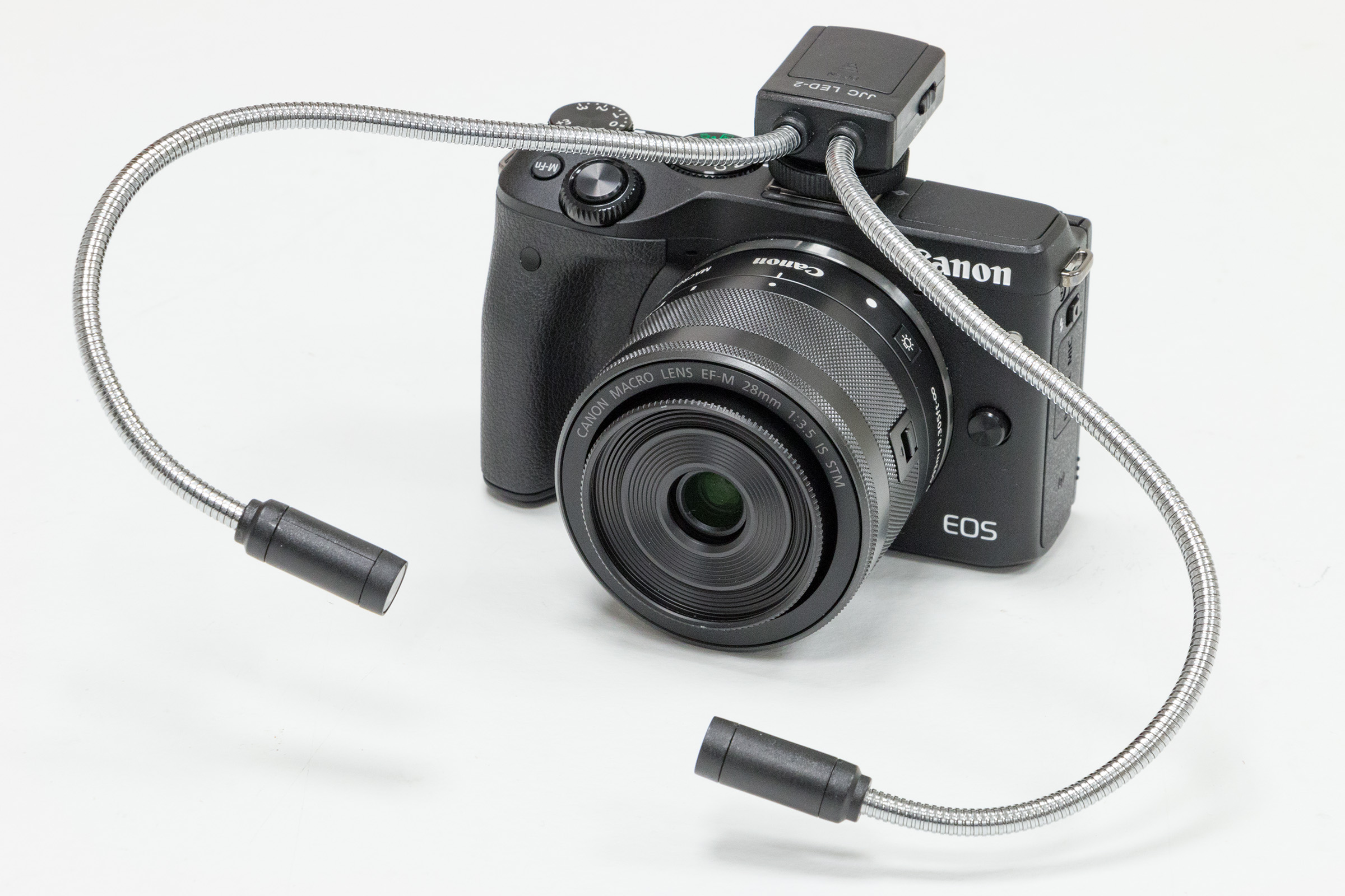 Losse LED’s Bij korte werkafstanden is de belichting van het onderwerp altijd een probleem. Daarom zijn er al langere tijd losse LED’s op de markt om dit euvel te ondervangen. Het voordeel hiervan is bovendien dat de lokale belichting flexibeler kan worden geregeld dan bij vaste LED’s op de frontlens. |