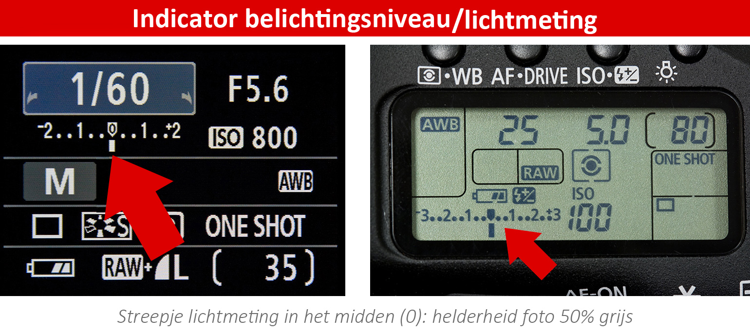 Waarom komt de helderheid van een foto overeen met wat we met onze ogen zien? Dit werkt als volgt. Als eerste meet de camera de hoeveelheid licht. Die lichtmeting wordt pas gestart als we de ontspanner van de camera half indrukken. Hij meet niet zozeer het licht wat aanwezig is, maar vooral het licht wat gereflecteerd wordt door het onderwerp zoals we dat in de zoeker van de camera zien. Vervolgens probeert de camera dat deel van het kader waarvan het gereflecteerde licht gemeten is een helderheid te geven van 50% grijs. Het streepje van de lichtmeting staat dan op nul.