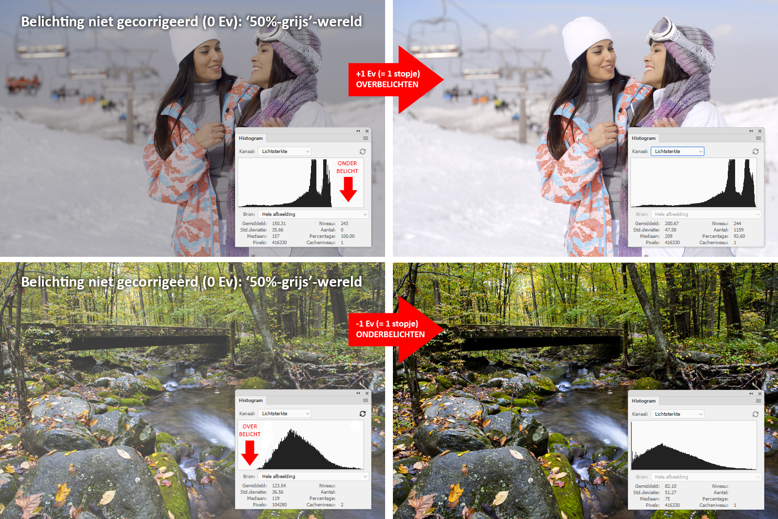 Als je namelijk in de zoeker van de camera grotendeels een licht onderwerp ziet (witte skipiste, portret voor witte muur, tekst op wit vel papier, grauwe lucht als achtergrond, vensterraam binnen als tegenlicht), dan zal de camera - als het streepje van de belichtingsmeting op nul staat - de foto toch een helderheid geven van 50%. Ook al zou je meer licht aandoen, dan zal hij de sluitertijd korter maken om toch aan het 50%-principe te kunnen blijven voldoen. Als je dus zo’n ‘wit’ onderwerp in de zoeker hebt, dan zul je de camera moeten vertellen dat hij de foto helderder moet maken en moet afstappen van het 50%-principe. Dit doe je als het streepje van de lichtmeting een positieve waarde heeft. In de M-stand moet je dat regelen door de combinatie van sluitertijd, diafragma en ISO aan te passen. Werk je in de P-, Av- of Tv-stand, dan moet je het streepje zelf op de gewenste positieve waarde zetten (handleiding camera: belichtingscompensatie of belichtingscorrectie). Bij een positieve waarde zal de foto dus helderder worden, omdat de camera óf een groter diafragma óf een langere sluitertijd óf een hogere ISO zal kiezen. Het gebruiken van een positieve belichtingscorrectie doe je dus bij ‘witte’ onderwerpen en wordt ‘overbelichten’ genoemd. Praktische waarden variëren tussen +1/3 en +2 stops (=Ev). Als je een witte skipiste of trouwjurk groot in beeld hebt, dan moet je dus een stopje overbelichten om wit niet grauw te laten worden. Pas wel op voor overbelichting.