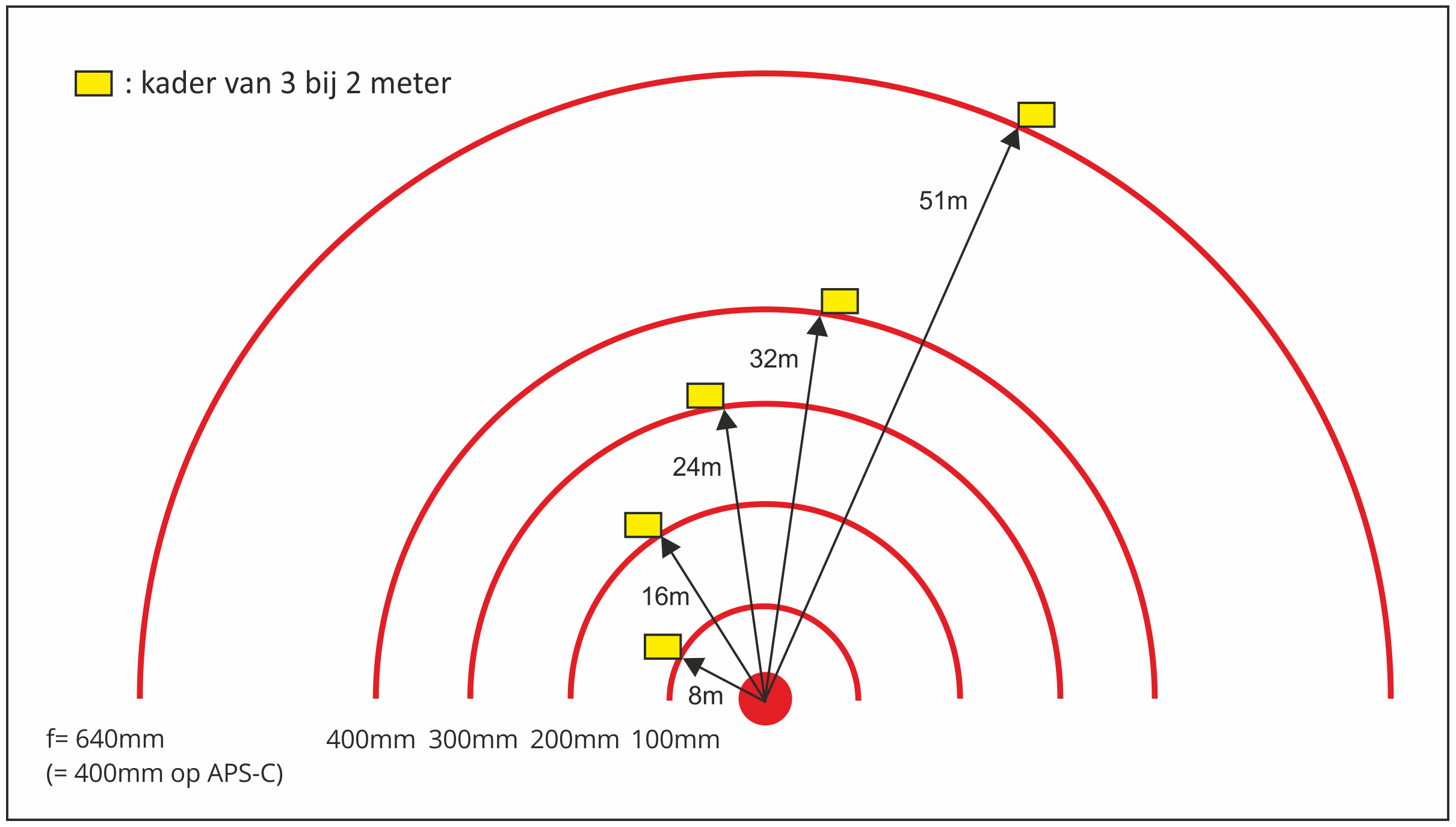 Heb je geen zin in rekenen, dan helpen onderstaande twee illustraties misschien beter. De bovenste afbeelding laat zien op welke afstand een kader van 3 bij 2 meter groot is als je ingezoomd bent tot een bepaald brandpunt (f=100mm, 200mm, 300mm of 400mm) op een camera met een volbeeldsensor. Zet je zo’n brandpunt op een APS-C camera, dan kom je dus 1,6x zo dichtbij.