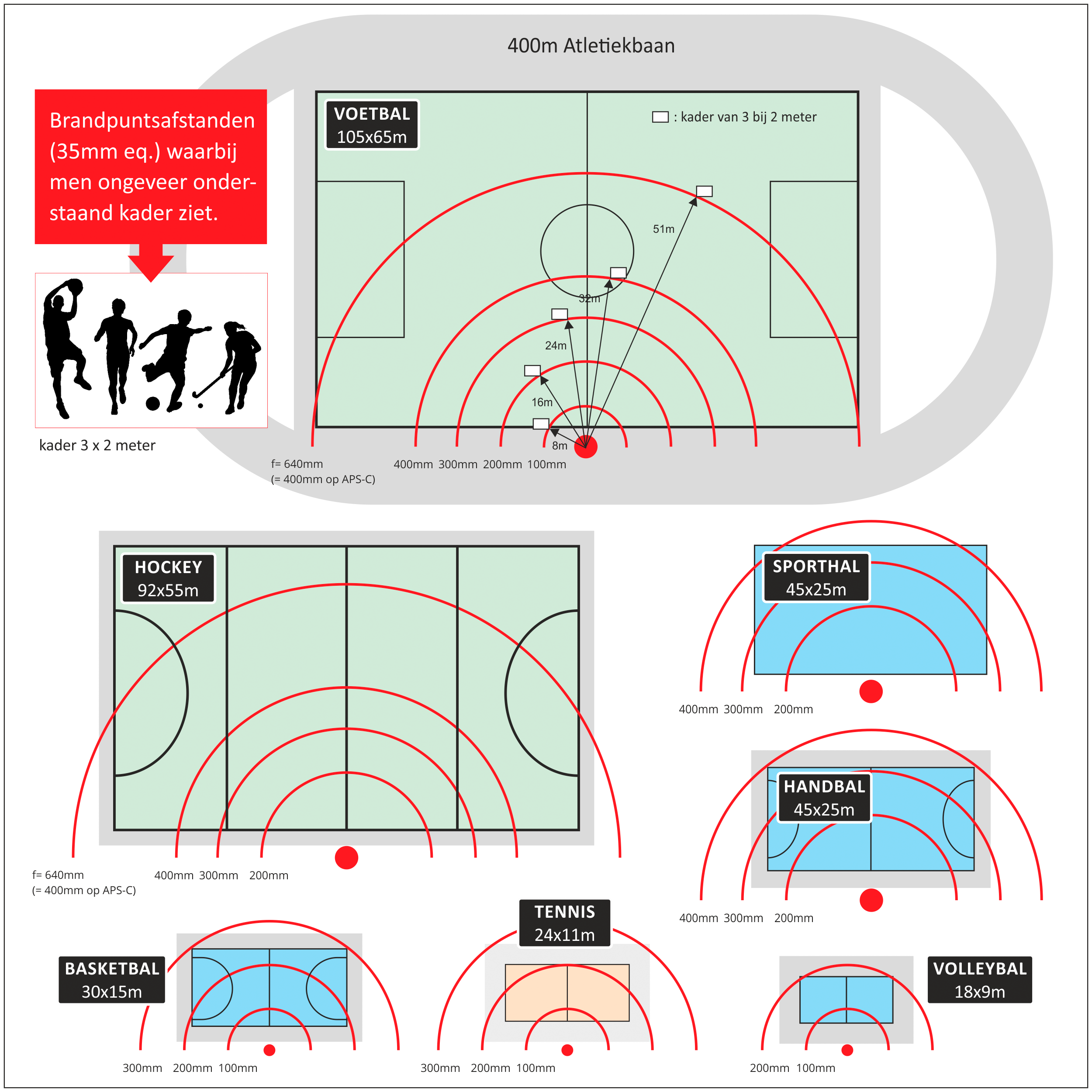Het verband tussen de straal van de cirkels en het brandpunt van de lens is vast gegeven, waarbij de grootte van het kader de constante factor is. Je kunt dit patroon onveranderd over een sportveld op schaal leggen (afbeelding 2) en je ziet meteen tot hoever je lens reikt. Een EF 70-200mm op een volbeeldcamera (EF-S 18-135mm op een APS-C camera) is dus ideaal voor binnensporten. Voor grotere sportvelden heb je een EF 70-300mm of - nog beter - een EF 100-400mm nodig om sporters close-up te krijgen.