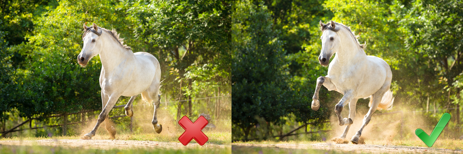 Het juiste moment vastleggen kan zeker in het begin erg lastig zijn. Heb je een snelle camera dan kun je gebruikmaken van continue opnamen, echter zit je buffer op een gegeven moment vol en is er de kans dat je nét mis schiet en je aan de hele reeks foto’s niets hebt. Het is dus goed om te leren timen, dat houd in dat je precies weet wat de reactietijd van je camera is op het moment dat jij op de sluiterknop drukt en er daadwerkelijk een foto wordt gemaakt. Als je dit doorhebt dan kun je nét voordat het paard de beenzetting heeft die je zo mooi vindt de foto maken en heb je met veel oefenen zo steeds het goede moment te pakken.