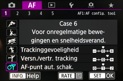 Eén van die tools is de ‘AF-cases’ die je tegenkomt in het cameramenu van de Canon 1Dx-serie, de 5D-serie en de 7D Mark II. Canon laat de gebruiker uit zes voorinstellingen kiezen, ook wel cases genoemd. Elk van deze cases wordt gepresenteerd via een specifiek sporticoontje.
