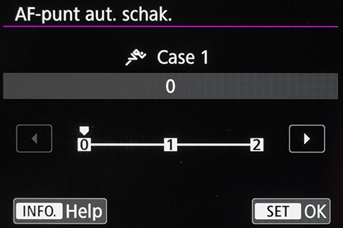 AF point auto switching beïnvloedt de snelheid van het wisselen van het ene AF-punt naar het andere iedere keer als je eerste AF-punt je onderwerp verlaat. Het zal dan sneller overschakelen naar omliggende AF-punten om zodoende het onderwerp te blijven volgen.