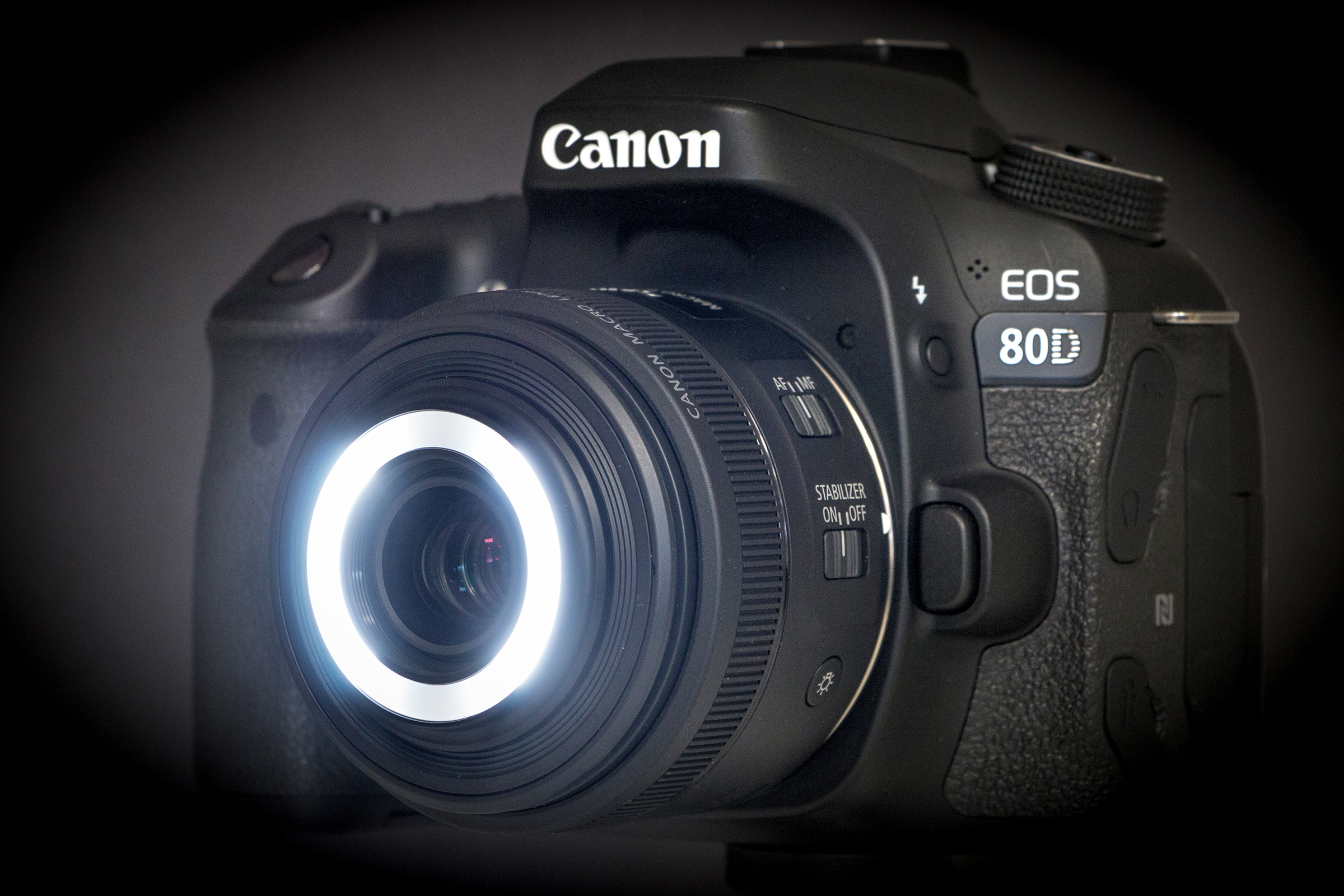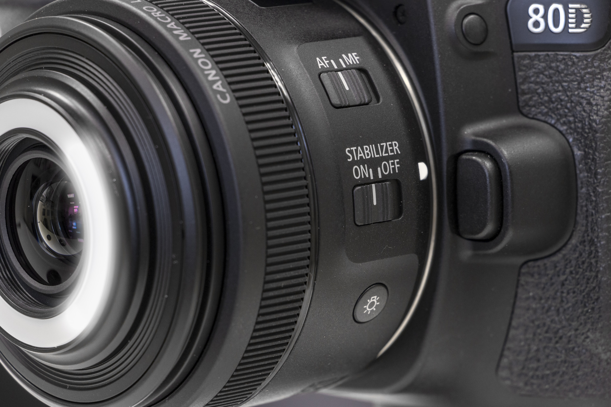 Het ringlicht op de EF-S 35mm f/2.8 bestaat uit twee segmenten, links en rechts van de frontlens. De lampjes kunnen in twee intensiteiten branden en de bediening gebeurt met een knopje op de lens. Ze kunnen beide worden aangezet of afzonderlijk links/rechts (langer indrukken).