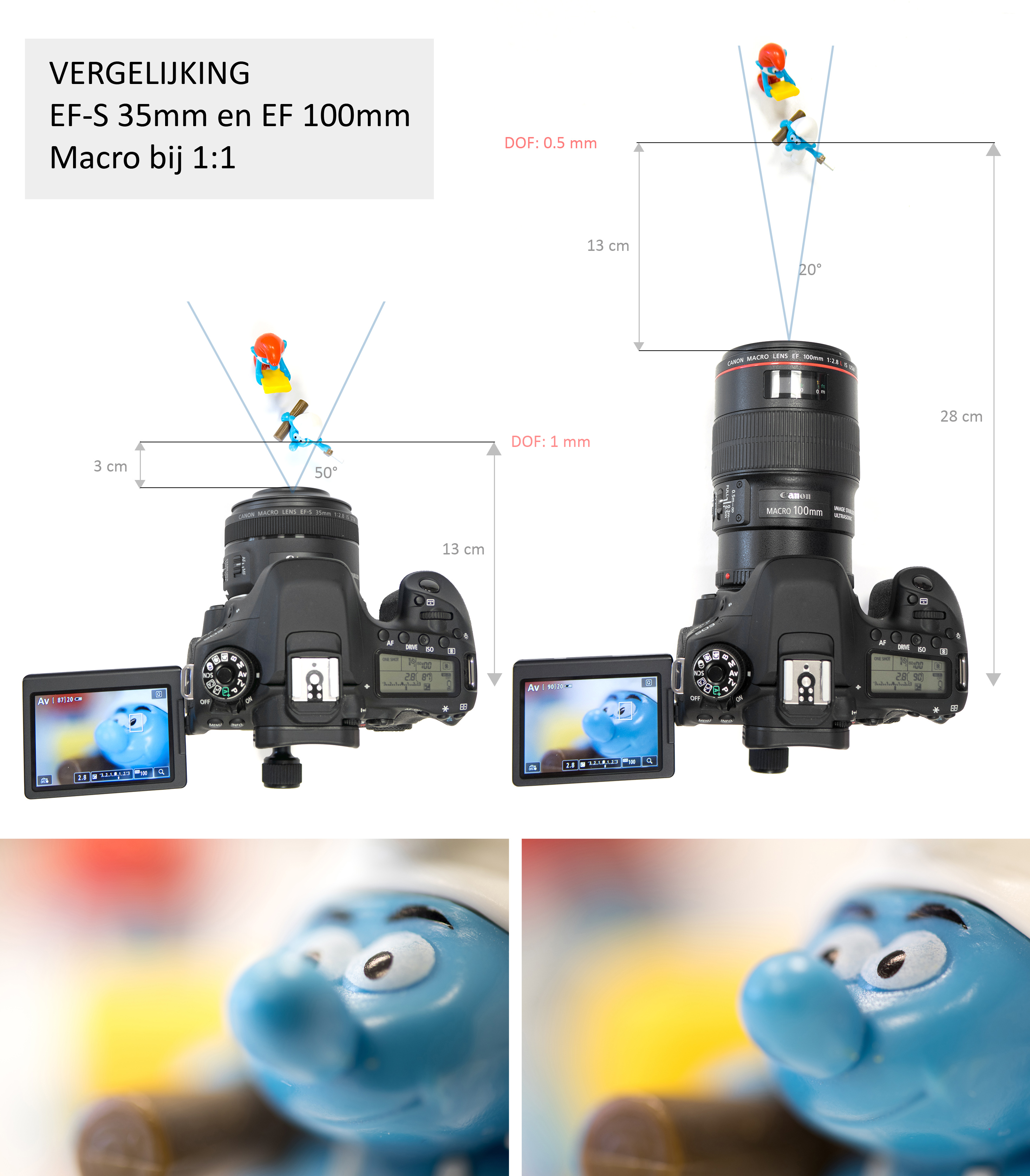 Beeldhoek en werkafstand van EF-S 35mm f/2.8 en van EF 100mm f/2.8. Let bij onderstaande foto's op grootte van de neus en vorm van ogen en mond (vervorming) en op de breedte van de achtergrond (bij 35mm zie je meer achtergrond)