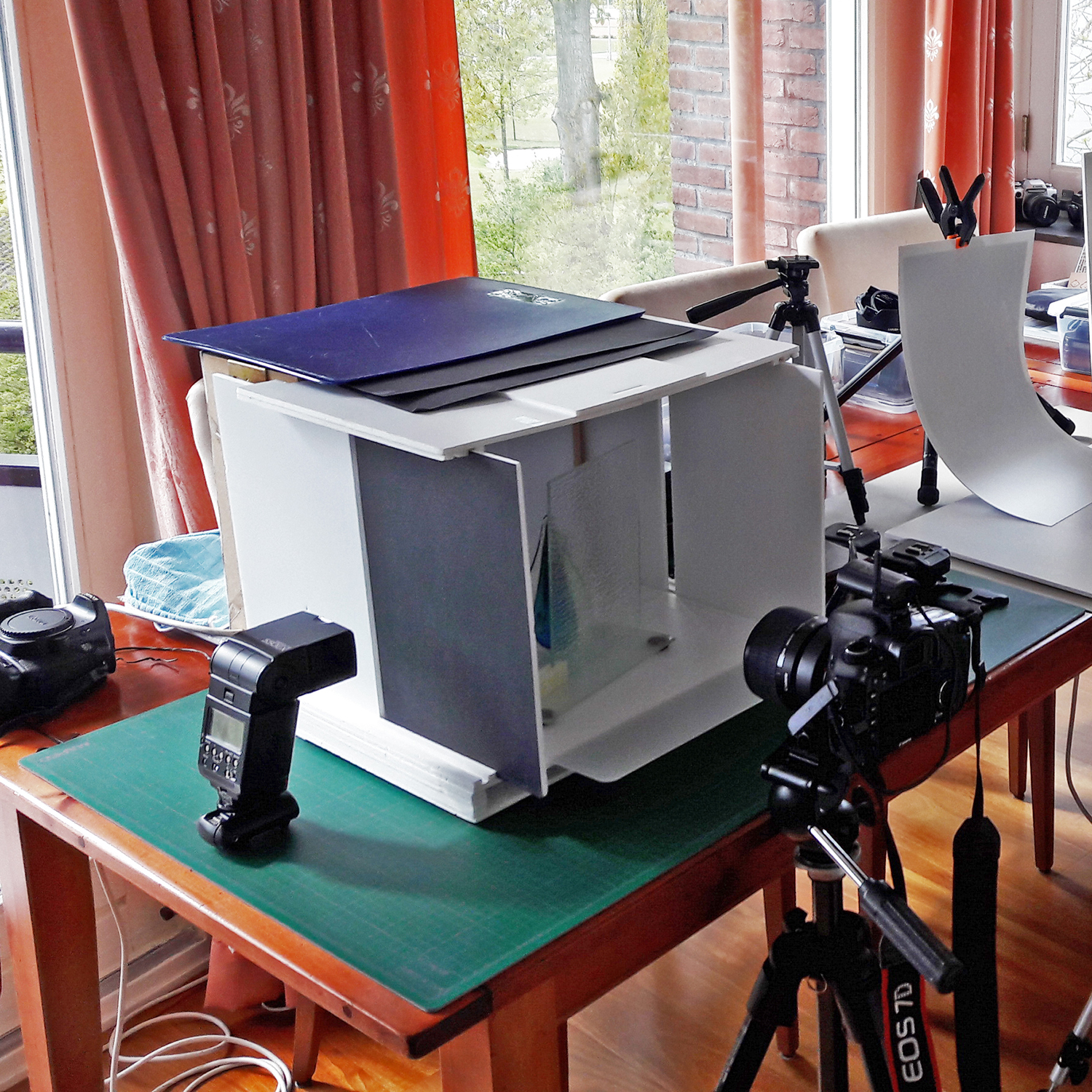 Natuurlijk heb ik het licht niet zomaar op het glas laten vallen, maar heb daarvoor een box gemaakt met een lichtbak voorzien van opaalglas als achtergrond. In die box staan aan de linker- en rechterkant een soort schuifdeuren, waarmee ik de hoeveelheid binnenvallend licht kan sturen. Tevens is het op die manier mogelijk om het licht voor of achter het onderwerp te laten vallen. Combineer dat met het tegenlichteffect van de lichtbak en je maakt interessante en intrigerende opnamen.
