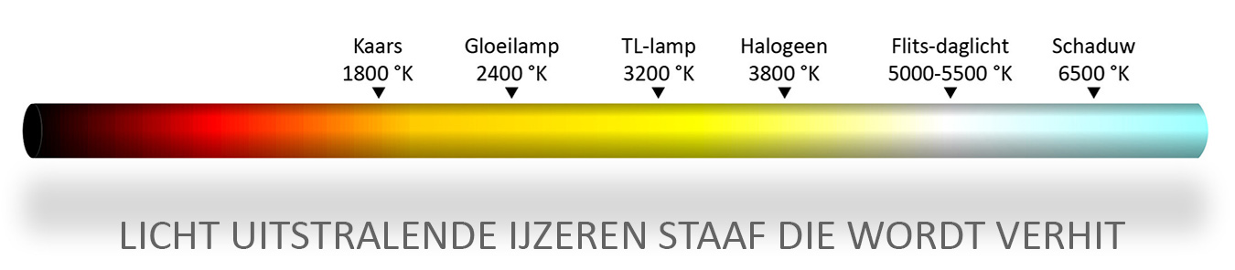 Bij 1000 K wordt de staaf donkerrood en naarmate de temperatuur wordt opgevoerd wordt het licht neutraler via oranjegeel bij 2500 K tot ‘wit’ bij 5000 K. Verhit je de staaf nog verder, dan wordt het uitgestraalde licht zelfs blauw. De oplettende lezer ziet hier weer een discrepantie met de gangbare terminologie, want het koudste licht (blauw) heeft de hoogste kleurtemperatuur. Onderstaand een lijstje met theoretische K-waarden voor de verschillende lichtbronnen, waarbij bij elke temperatuur een marge zit van minstens +/- 100, omdat bijvoorbeeld niet elke soort lichtbron exact dezelfde kleurtemperatuur heeft. Zo is van LED- of TL-verlichting een koele en warme versie verkrijgbaar.