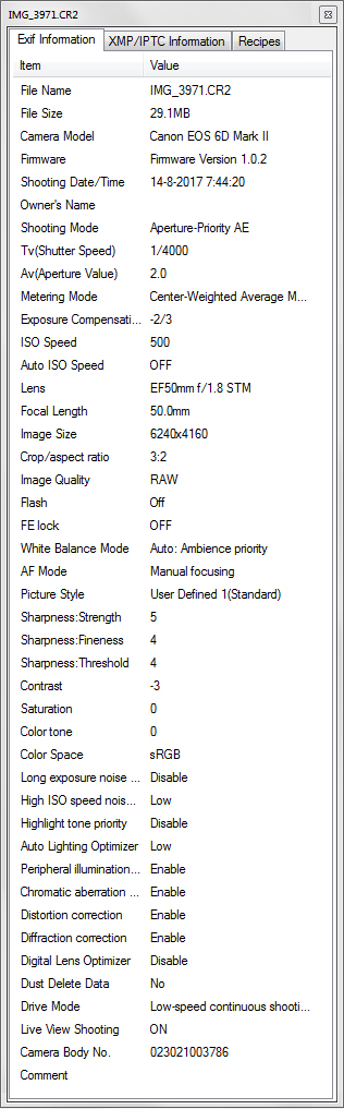 Wil je van een foto de Exif-gegevens zien, dan kan dit met de toetsencombinatie Ctrl+I. Hierin zie je parameters en waarden die door andere Exif-viewers niet worden herkend, zoals Lichte tonen prioriteit of de gebruikte beeldstijl. Je ziet onderaan zelfs het serienummer van de camera, ten teken dat de foto met jouw camera is genomen.