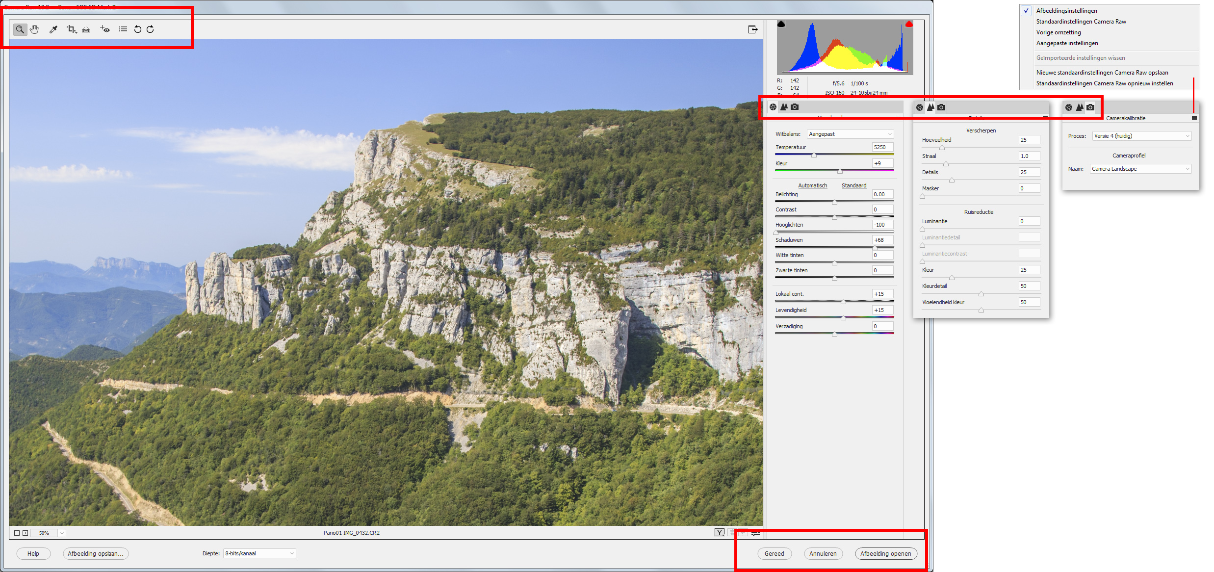 Als je Photoshop Elements gestart hebt, dan kun je in de Expertmodus van de Editor de betreffende RAW-bestanden openen. Dat kunnen er meerdere zijn. Er wordt dan een tussenvenster geopend van Adobe Camera RAW. Hierin tref je de bovengenoemde parameters, waarmee je helderheid, kleuren en scherpte van je RAW-opname(n) kunt optimaliseren. Je kunt aanpassingen op meerdere bestanden tegelijk toepassen en je kunt recepten van de ene RAW-foto naar de andere kopiëren. Ben je tevreden met de aanpassingen, klik dan op Afbeeldingen openen en ze worden in de editor van Photoshop Elements getoond. Hier kun je nog kleine aanpassingen doen, zoals retoucheren, kopjes verwisselen, lensafwijkingen corrigeren en nog veel meer. Ben je daarmee klaar, dan sla je het resultaat op als JPEG, TIFF, PNG of PSD.