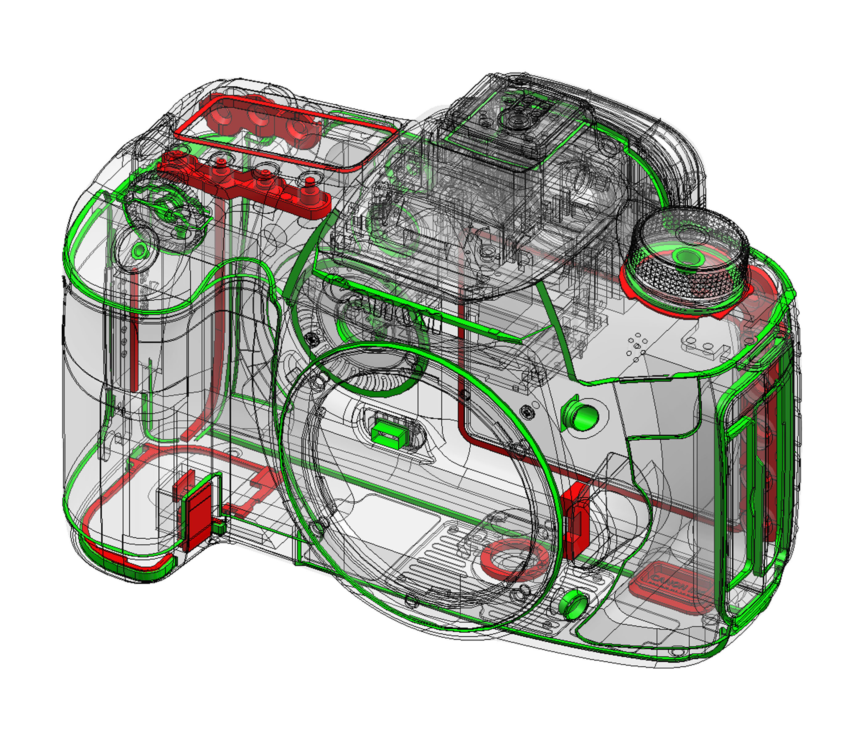 Ten opzichte van de EOS 50D is de 'bobbel', waarin zich het pentaprisma bevindt hoger geworden. Dit komt ten goede aan de grootte van het zoekerbeeld, wat vooral bij lichtsterke lenzen helderder en groter is dan van andere EOS-camera's met een APS-c sensor. Een van de grootste veranderingen en geheel uniek voor de EOS-sen in de xxD- en xD-serie is een aparte Aan/uitknop. Dit was blijkbaar een wens van veel fotografen en als je er eenmaal aan gewend bent, is het inderdaad minder verwarrend dan de vorige Aan/uitknop die eigenlijk twee functies had, namelijk aan/uit en activeren van het hoofdinstelwiel. Deze laatste heeft nu een eigen Lock-knop gekregen. Hoewel Canon nog vasthoudt aan een Direct-printknop heeft deze in de opnamestand een nieuwe functie gekregen om snel te kunnen wisselen tussen RAW en JPEG. Om de opname-instellingen ook op het lcd-scherm te zien, beschikt de EOS 7D over een aparte Q-knop. Voorheen moest dat met een druk op de joystick. Een algehele verbetering van alle knopjes en klepjes is verder dat ze stof- en spatwater zijn afgedicht, zoals bij de 1D-serie. Als je dus met de EOS 7D (mét een L-lens) in de regen of sneeuw terecht komt, hoef je niet direct bang te zijn voor storingen.