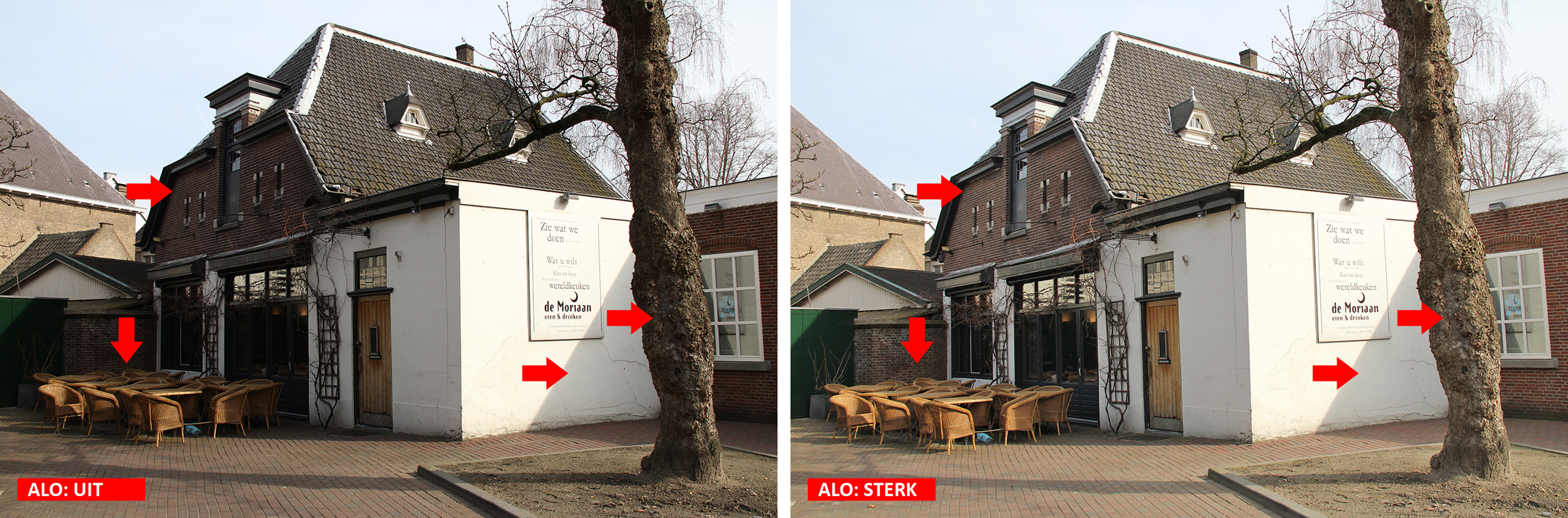 De andere belichtingsparameter, ALO, werkt meer als een soort digitale invulflits, die in drie sterktes kan worden toegepast. Ze is ideaal als je bijvoorbeeld een opname maakt van een exotisch steegje onder een felle zon. Een invulflits heeft dan weinig zin, maar ALO zal de schaduwen verhelderen zonder dat detail in de hooglichten verloren gaat. Er kan wel iets meer ruis in de donkere gebieden zichtbaar worden. Lichte Tonen Prioriteit en Auto Helderheid Optimalisatie kunnen niet gelijktijdig ingesteld worden. We hebben ALO en HTP 'losgelaten' op onze 'testcase' in de volle zon. Het resultaat van ALO zie je hieronder.