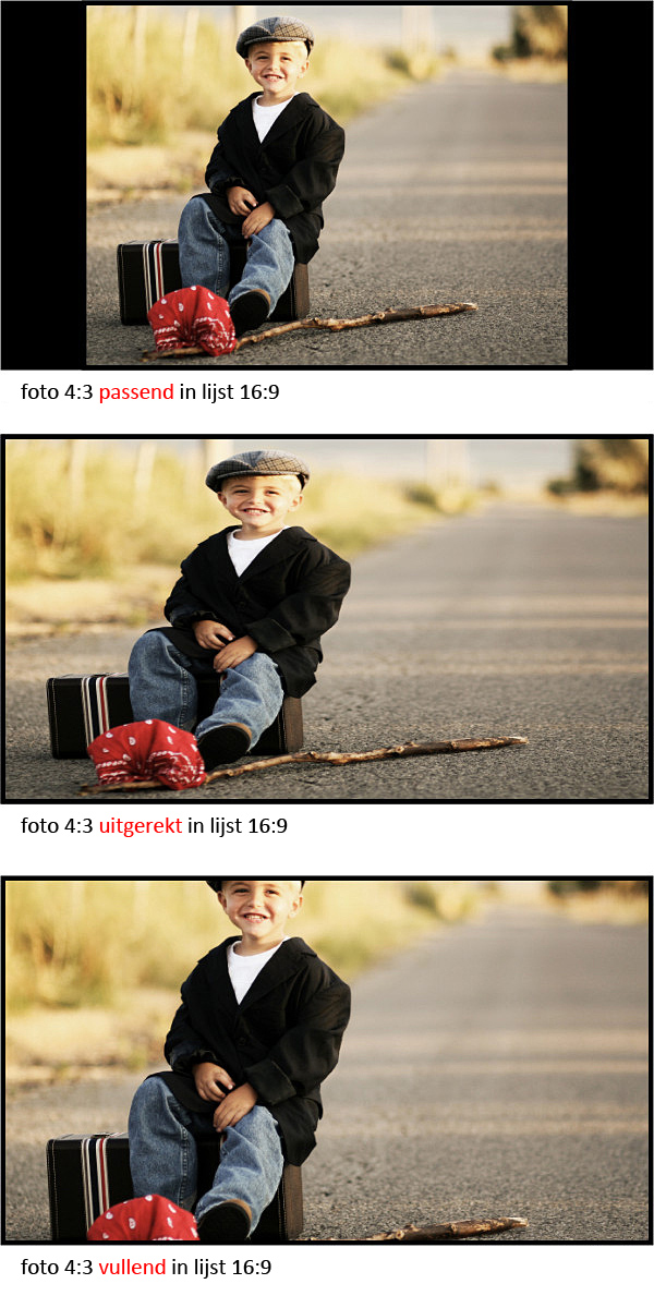 LET OP De breedte-hoogteverhouding van foto's en van fotolijstjes kan 4:3, 3:2 of 16:9 zijn. Helaas stemmen ze niet altijd overeen. Een 4:3 foto kan op een 16:9 op verschillende manieren worden weergegeven: zwarte banden links en rechts, uitgerekt over de hele breedte, boven en onderkant vallen weg. De gewenste weergave kan meestal op de lijst worden ingesteld. Heb je liever zelf controle, pas dan met Canvas- of Doekgrootte de verhouding van je foto's exact aan aan die van de lijst. |