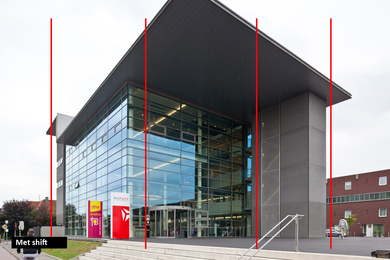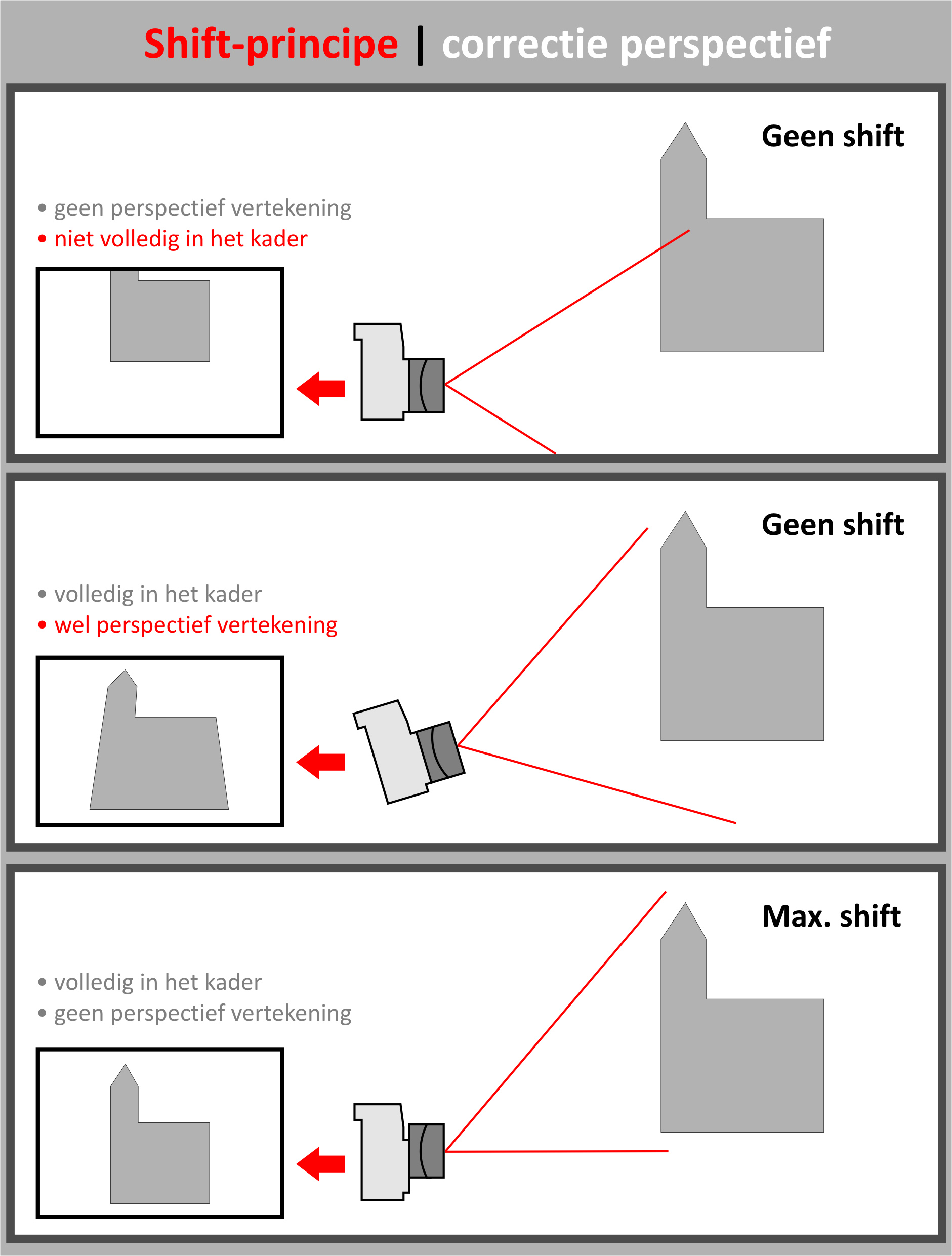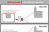 Shift (schuiven)De Shift-functie geeft de mogelijkheid om de lens evenwijdig aan het sensorvlak horizontaal of verticaal te verschuiven. Omdat de beeldcirkel zo groot is, kan men daarmee het kader verschuiven zonder dat de camera van positie of stand veranderd hoeft te worden. Hiermee kan perspectiefvervorming bij opname al worden gecorrigeerd. Sta je met je camera voor een groot gebouw, dan moet je je camera naar boven kantelen om alles binnen het kader te krijgen. Omdat het sensorvlak dan niet evenwijdig loopt aan de muren van het gebouw, zal perspectiefverloop ontstaan. Laat je sensor en muren wel evenwijdig lopen, dan staat alleen de onderkant van het gebouw in het kader. Nu toont de Shift-functie zijn kracht, want door in deze stand de lens naar boven te schuiven, krijg je toch het hele onderwerp in het kader zonder dat de camera gekanteld hoeft te worden en wordt dus perspectiefverloop voorkomen. Net als bij de Tilt-functie kan men Shift ook tegengesteld gebruiken en daarmee juist perspectief versterken.