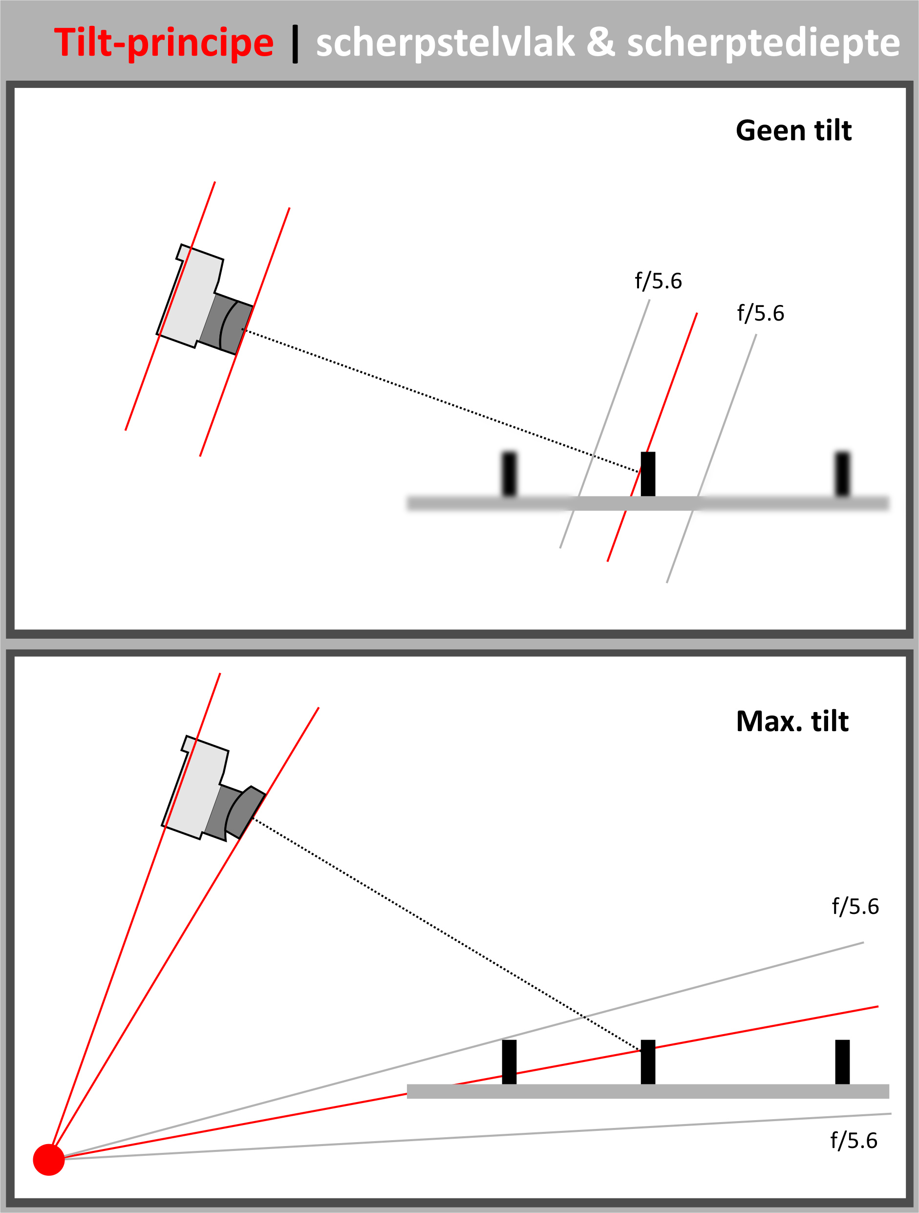 Behalve dat het scherpstelvlak naar de diepte van het onderwerp gekanteld kan worden, kan dat ook in tegengestelde richting, zodat juist een zeer kleine scherptediepte wordt bereikt. Zo kan van een vergezicht een miniatuuropname worden gemaakt en levert dit bijzondere portretten of close-ups (min. scherpstelafstand 21cm!) op.