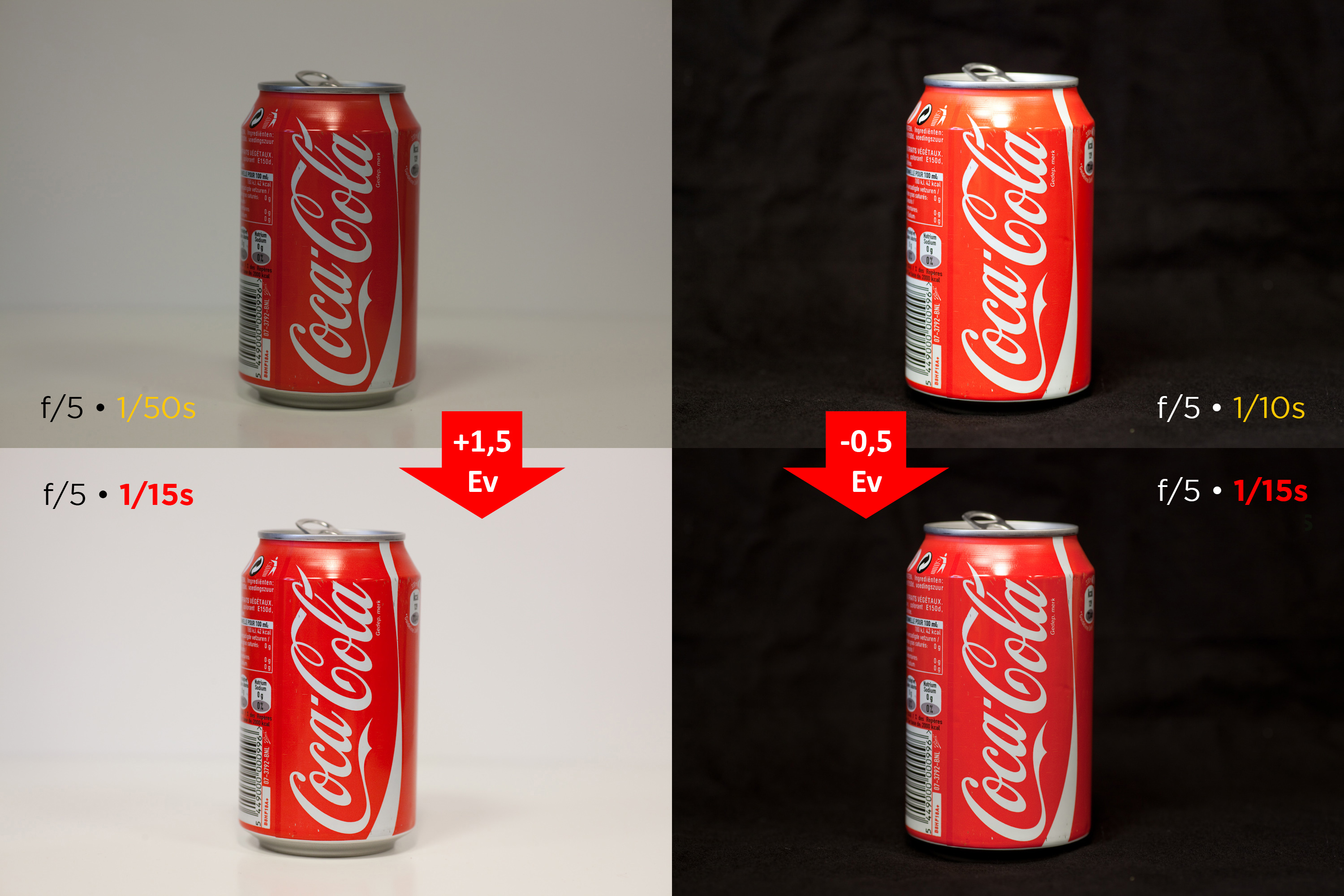 In beide gevallen zie je in een balkje met een verloop van -3 tot +3 een blokje verschuiven. Negatieve waarden van de belichtingscompensatie zorgen ervoor dat een foto donkerder wordt (kortere sluitertijd en/of kleiner diafragma) en positieve waarden maken de opname lichter (langere sluitertijd en/of groter diafragma). De eenheid van belichtingscompensatie is Ev (Exposure Value) en staat gelijk aan één stop, dus 2x meer of minder licht. Bij een wit onderwerp (skipiste, witte achtergrond, kadervullend wit voorwerp) gebruik je een belichtingscompensatie van +1 of +2 Ev. Bij een donker onderwerp moet je onderbelichten. Dit zou bijvoorbeeld bij een zonsondergang het geval kunnen zijn om met -1 Ev toch een mooi doortekende lucht te krijgen (en dus een bijna zwarte voorgrond).