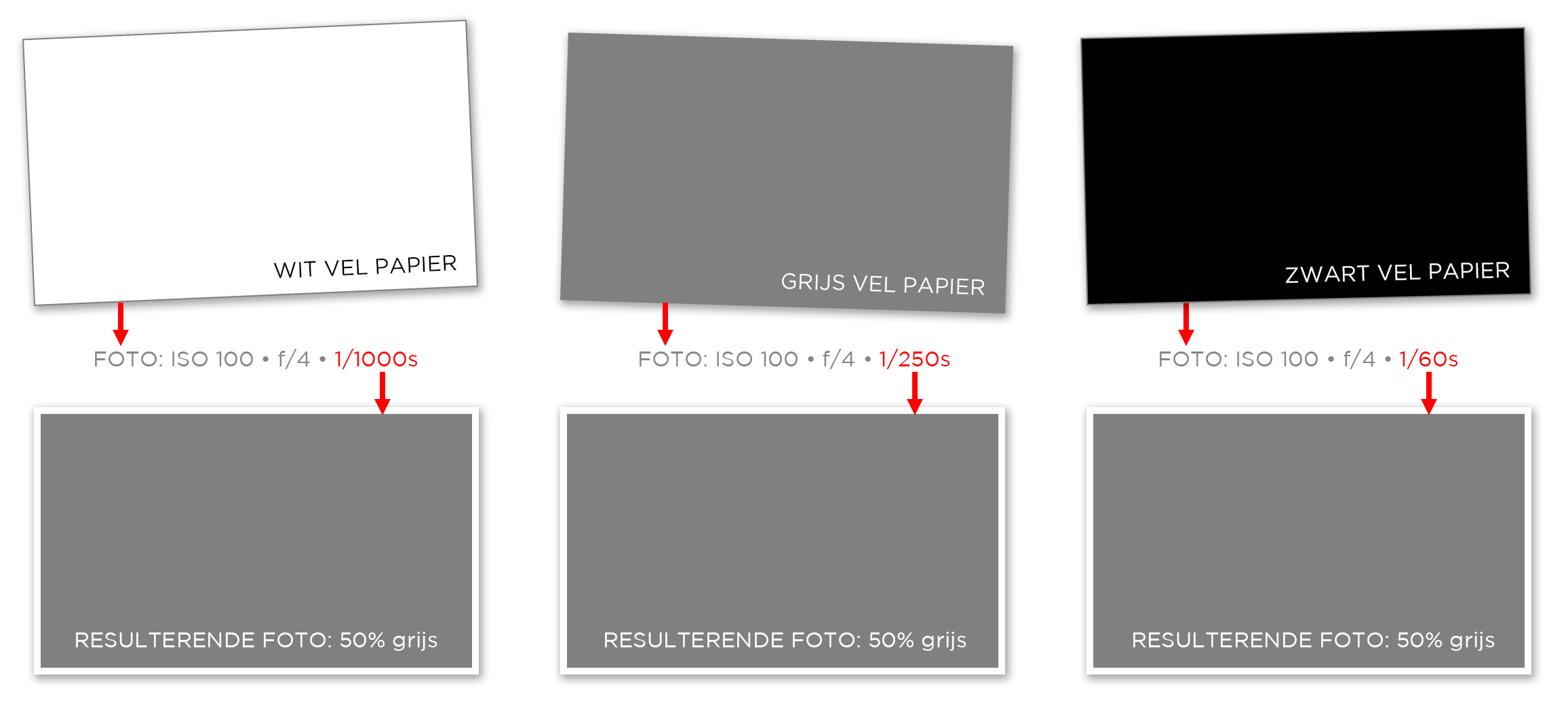 Als je alle kleuren van het onderwerp in het kader van de zoeker van je camera op basis van hun helderheid om zou zetten naar grijstinten en je zou die in een emmer gooien en homogeen mengen, dan resulteert dat in een grauwe massa van ongeveer 50% grijs. Voor 75% van de dagelijkse onderwerpen geldt deze 50%-norm (+/- 10%) en daarom hebben ze dit principe ook toegepast om de belichting van een camera automatisch te regelen.