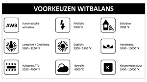 Kijk je bij de witbalansinstellingen van je camera, dan zie je naast de AWB ook nog veel voorkeuzen als Gloeilamp (Tungsten), TL (Fluorescent), Schaduw (Shade), Bewolkt (Cloudy), Flits (Flash), Daglicht (Daylight). Toepassing hiervan spreekt voor zich en de resultaten zouden beter kunnen zijn dan met de AWB. Voorzichtigheid is echter geboden, want als je binnen met Gloeilamp hebt gefotografeerd, je zet de camera uit en de volgende dag maak je hiermee foto's in de tuin bij daglicht, dan zullen al je foto sterk blauw gekleurd zijn en nauwelijks nog te herstellen. Met de witbalans Schaduw binnen bij TL-licht fotograferen geeft alle foto's een sterke gele kleurzweem. Ook dichter bij een venster met daglicht gaan staan, doet de kleurtemperatuur van het licht veranderen en geeft dus een grotere kans op een verkeerde kleurcorrectie.