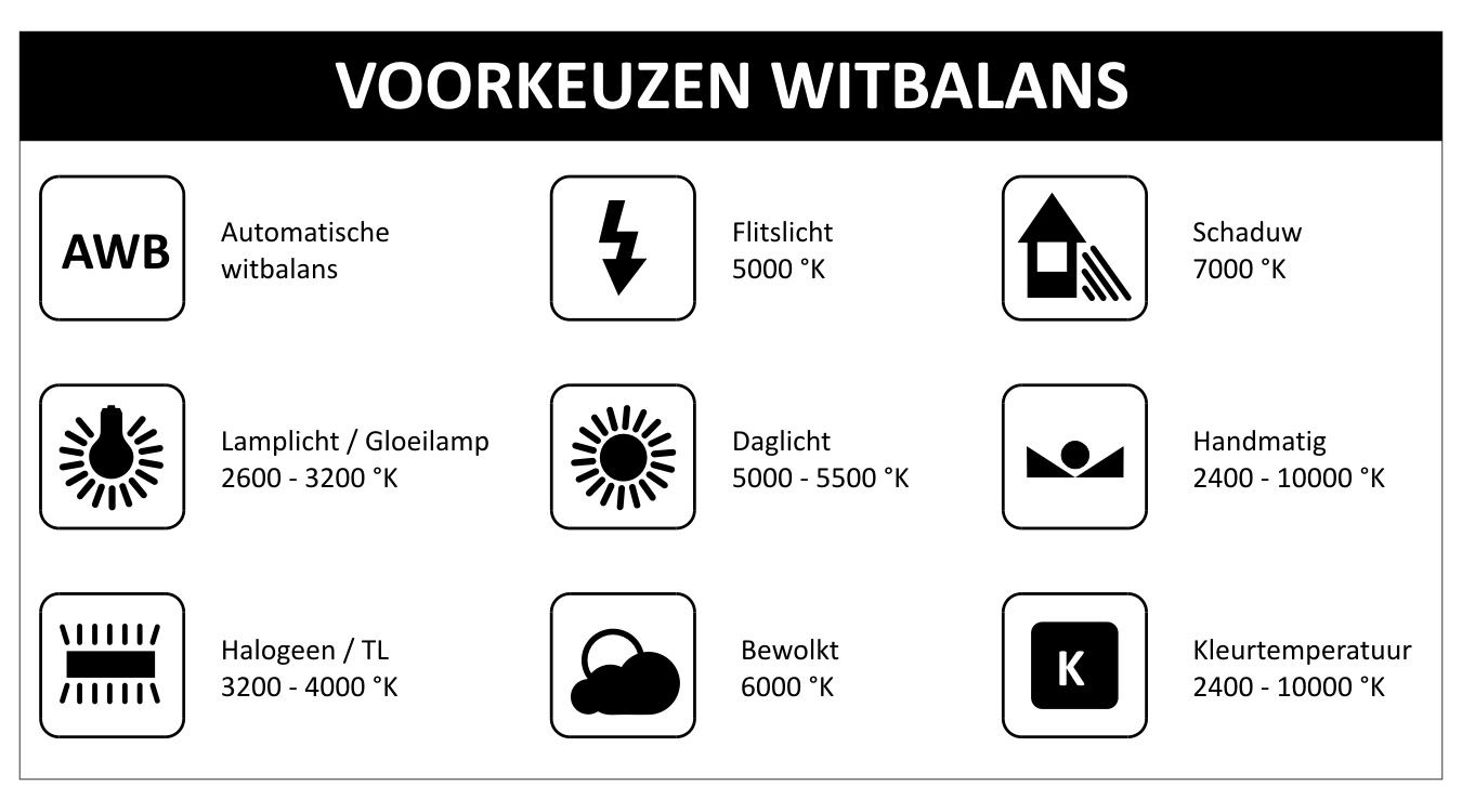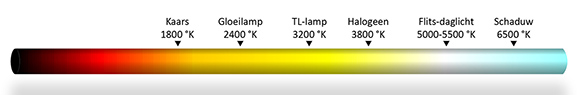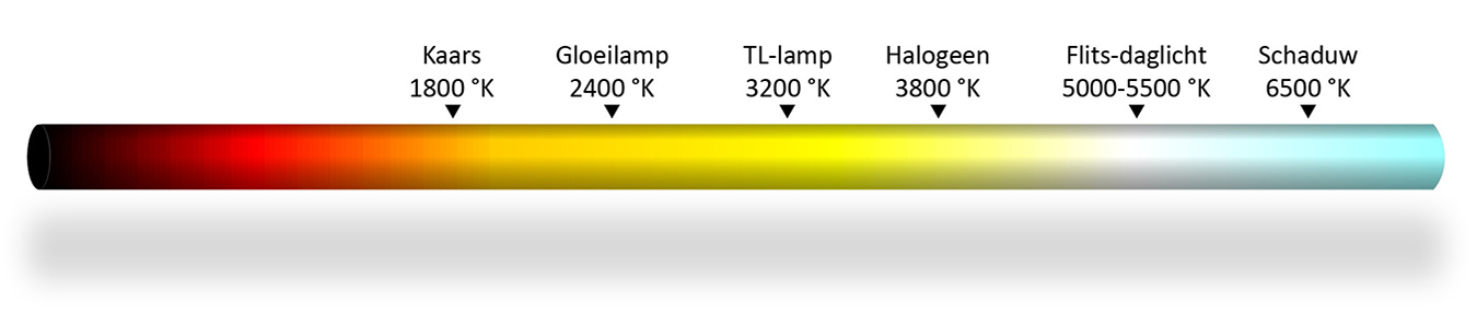 Elke lichtbron zendt zijn eigen kleur licht uit. Dan hebben we het niet over een rode of groene lamp, maar over het 'witte' licht van de zon, een TL-buis, een kaars of de schaduw buiten. Deze lichtbronnen zijn voor het menselijk oog mogelijk allemaal wel 'kleurloos', maar voor een digitale camera zijn er grote verschillen. Deze verschillen zijn gekoppeld aan de kleurtemperatuur van een lichtbron. Dit begrip heeft te maken met de kleur van het licht dat uitgezonden wordt van een zwart stuk metaal dat wordt verhit. Bij 1800 graden Kelvin (= graden Celcius plus 273) is dit metaal oranjegeel. Maken we het warmer, dan is het metaal bij 3200 °K lichtgeel en bij 5000 °K kleurloos (wit). Voeren we de temperatuur nog verder op, dan begint het boven de 6000 °K steeds blauwer te worden. Deze kleurtemperaturen kunnen zodoende gekoppeld worden aan lichtbronnen. Kaarslicht is dan 1800 °K, een TL-buis 3200 °K, een flitser 5000 °K, daglicht 5500°K en een betrokken dag en donkere schaduw respectievelijk 6500 en 8000 °K. Alle waarden zijn indicatief.