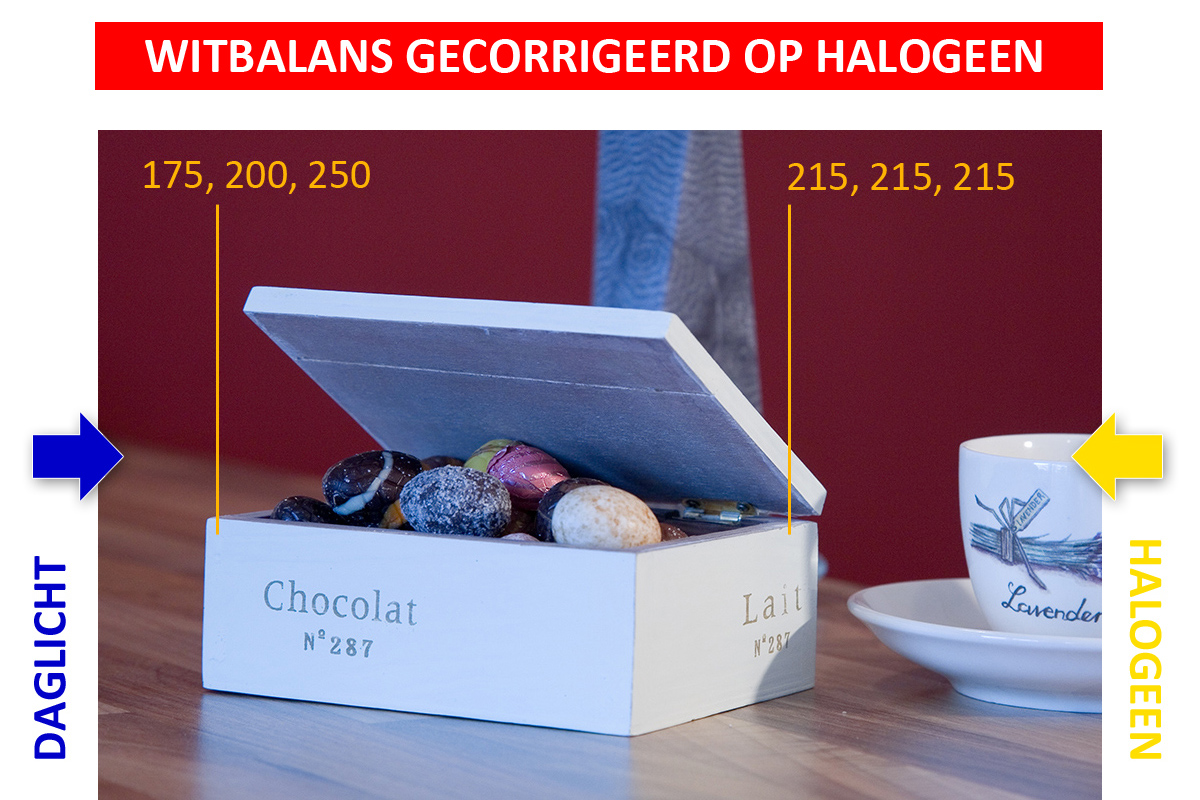 MENGLICHT Soms wordt een onderwerp belicht door twee lichtbronnen met een verschillende kleur-temperatuur, bijvoorbeeld daglicht van een vensterraam en kunstlicht van een halogeen-lamp in de kamer. De perfecte witbalans bestaat dan niet zonder de ontstane kleurzweem achteraf met selecties te corrigeren in Photoshop. Een werkje voor gevorderden. |