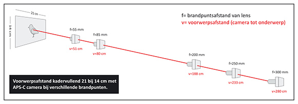 We hebben een simpel proefje uitgevoerd. Op een EOS 50D hebben we verschillende lenzen geplaatst en daarmee een voorwerp van 21 bij 14 cm (half A4-tje) beeldvullend gekaderd. Bij elk brandpunt hebben we gemeten hoe ver we van het onderwerp stonden. Ingezoomd met je 18-55mm sta je dan dus ongeveer een halve meter van het genoemde voorwerp en als dat een koolmees in de tuin zou zijn, dan zou de vogel allang gevlogen zijn. De werkafstanden worden pas interessant als je op een APS-c camera een telelens met een brandpunt gebruikt van 200 mm of meer, zodat je meer dan twee meter van het onderwerp afstaat. Dan is het nog steeds niet eenvoudig om een goede foto te maken, maar als je de vogels laat wennen aan je aanwezigheid, je hebt niet te fel gekleurde kleding aan en je doet alle handelingen heel rustig zonder veel lawaai, dan zal het op een zeker moment wel lukken. Een beetje camouflage of schuilhut kan zeker bijdragen tot een goed resultaat.