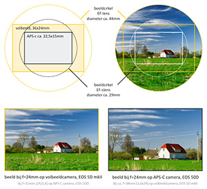 Bijna alle lenzen met een vast brandpunt hebben een EF-vatting en zijn oorspronkelijk bedoeld voor volbeeldcamera's als de 1D en 5D-serie. Ze passen dus ook op EOS-camera's met een APS-C sensor. De beeldhoek wordt echter kleiner, dan op een volbeeldcamera en met een 50mm lens op een EOS 450D zie je hetzelfde als met een 80mm op een EOS 5D (factor 1,6). Een 24mm is een groothoek op een EOS 1Ds, maar verliest veel weidsheid op een EOS 500D. Wil je op die camera ook die grote beeldhoek, dan heb je een brandpunt nodig van 15mm (factor 1,6)