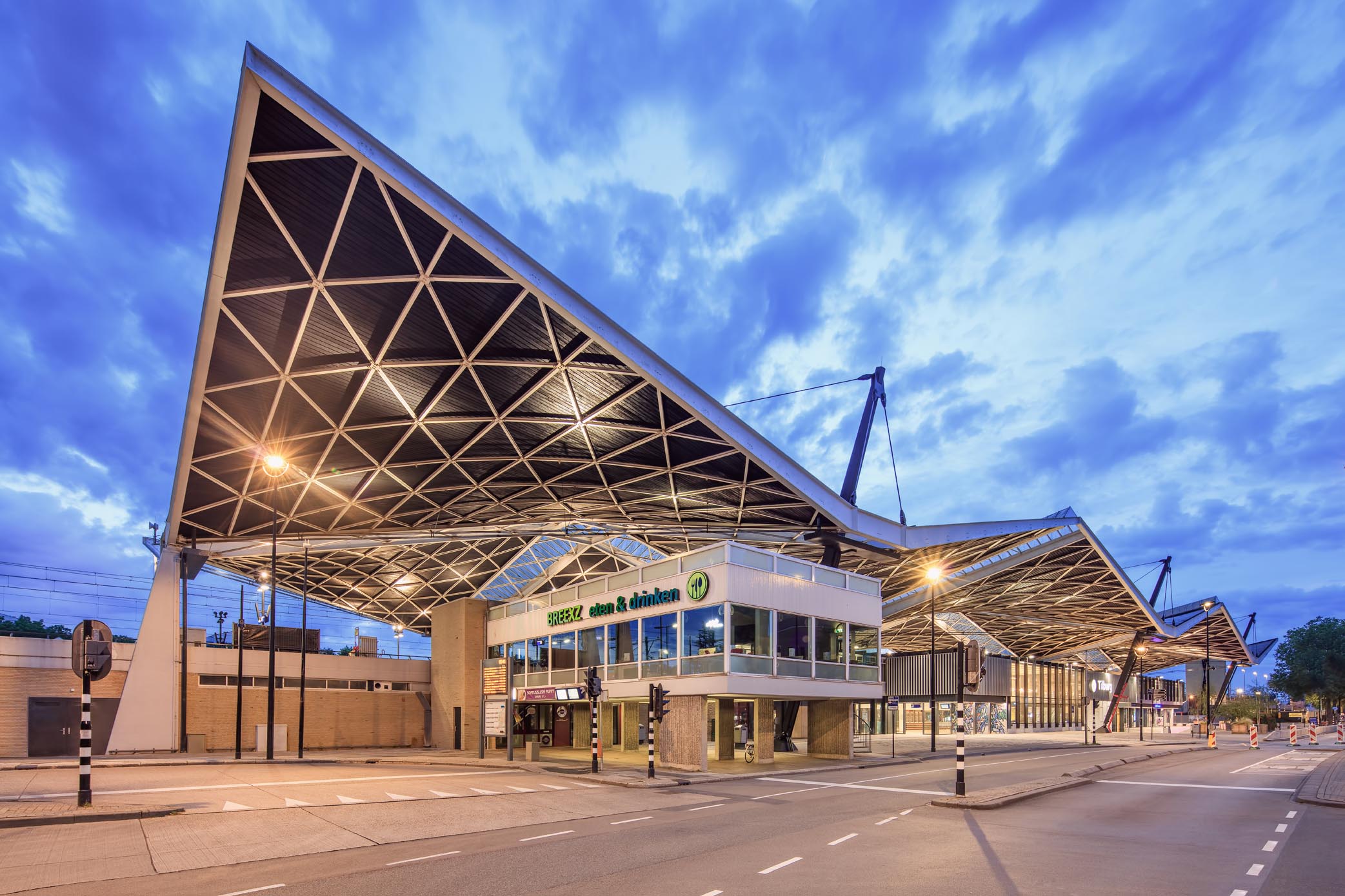 Maar een gebouw dat altijd tot mijn persoonlijke verbeelding heeft gesproken is het Centraal Station met het spraakmakende kroepoekdak, naar een ontwerp van de architect Koen van der Gaast. Het werd gebouwd in 1965 en wordt getypeerd door een hoge, opmerkelijk vormgegeven zwevende overkapping, waaronder de perrons en restauratie liggen. Het is een lastig gebouw om te fotograferen omdat het zo dicht tegen de Spoorlaan ligt waardoor er geen ruimte is om afstand te nemen. Slechts op enkele momenten van de dag heb je een ideale zonstand om het gebouw zonder hinderlijke schaduwen totaal in beeld te krijgen. Daarom koos ik voor een night shot.