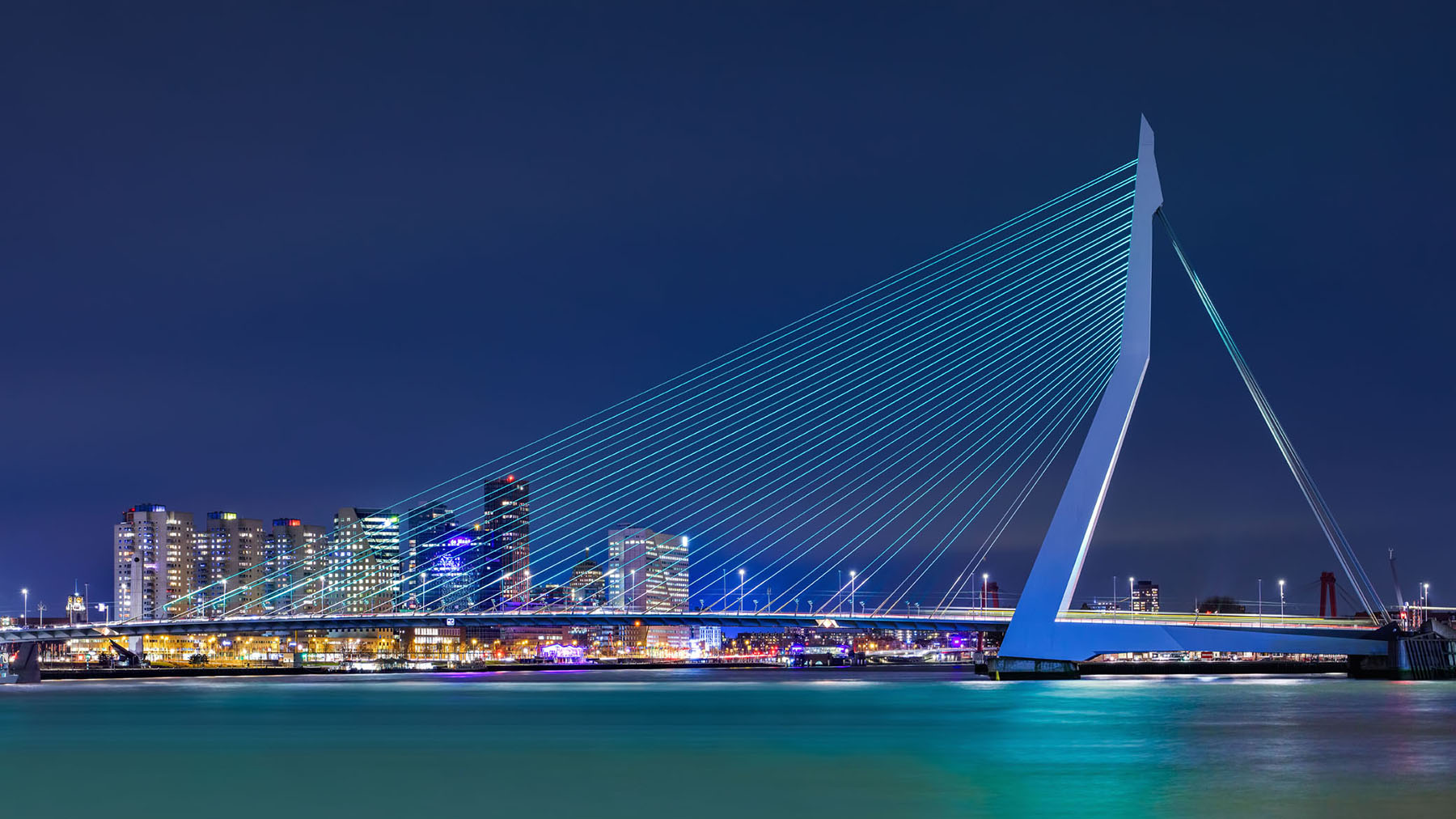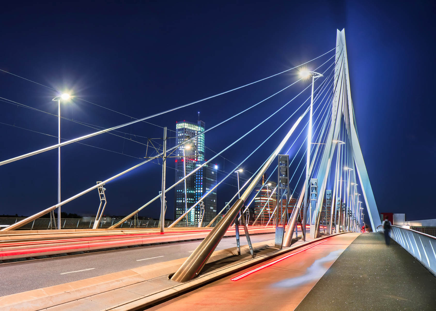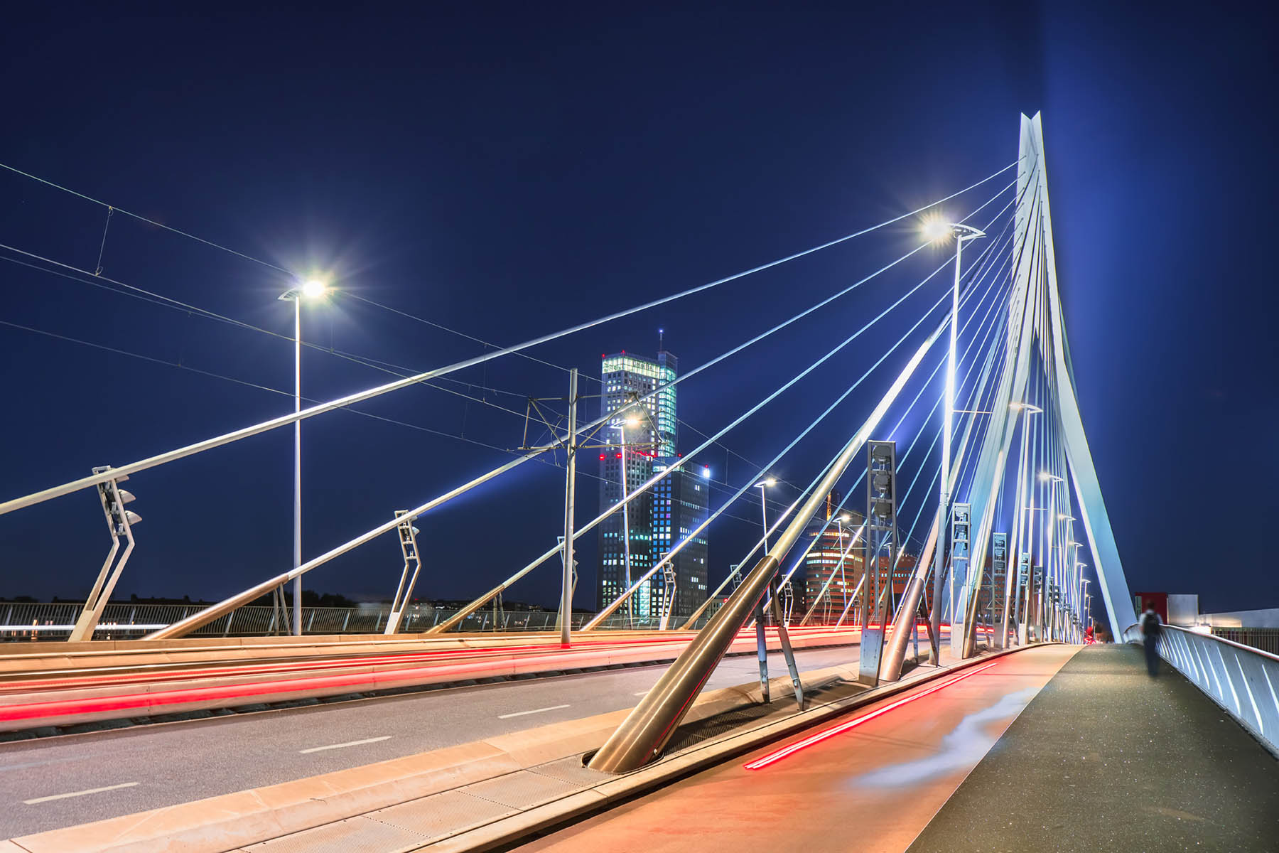 Al vele jaren ben ik als fotograaf kind aan huis op de Kop van Zuid R’dam wat voor mij nog steeds de heilige graal is van Architectuurfotografie. Zo heb ik door de jaren heen dan ook de iconische Erasmusbrug op verschillende manieren op de plaat gezet. De ruim 800 meter lange stalen kolos, die is geschapen door Ben van Berkel, spreekt bijna 30 jaar na de opening nog steeds tot de verbeelding, althans de mijne. En dat is bepaald geen geringe verdienste van deze architect!