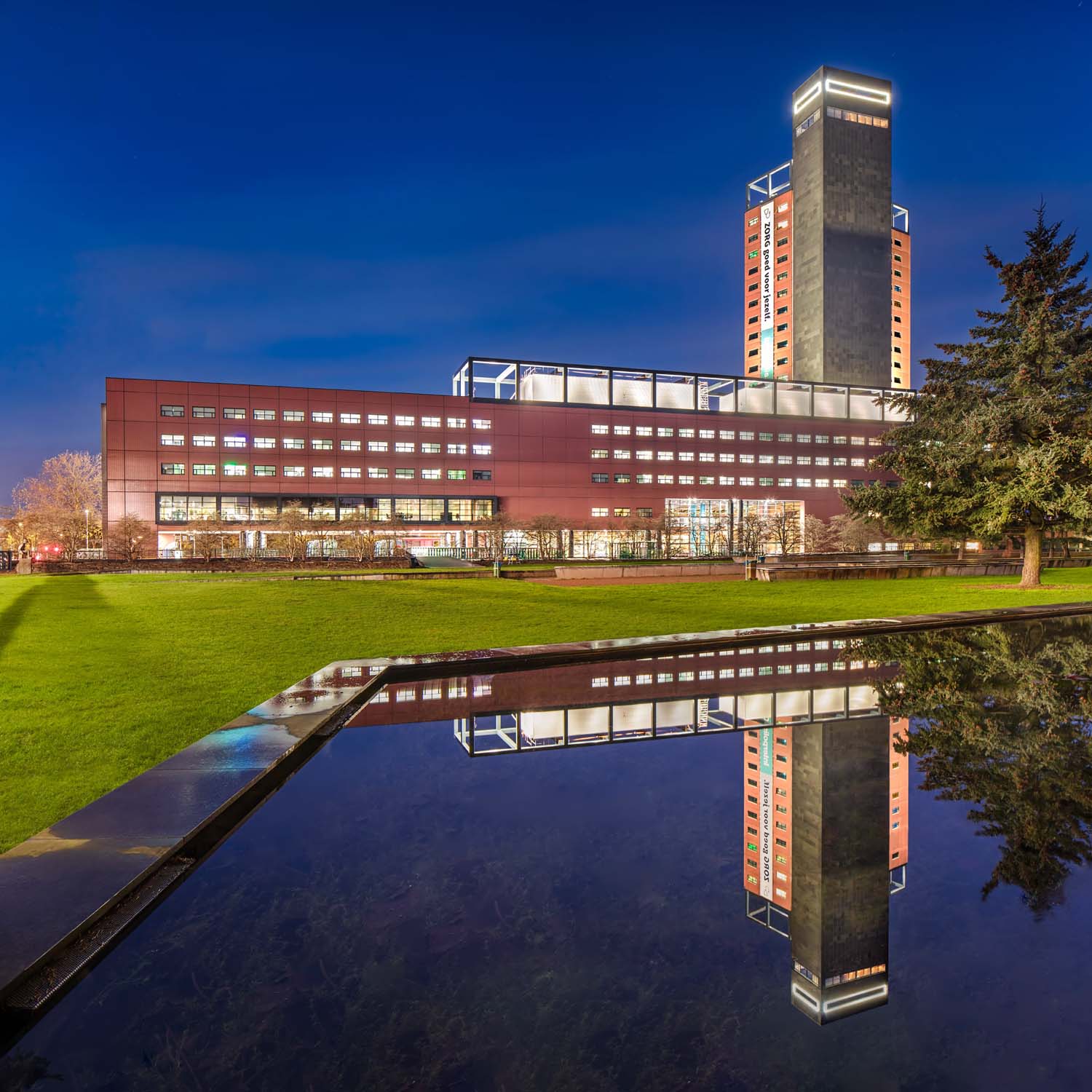 Ook kwam ik erachter dat de bovenste etage van de aanpalende Tivoli parking een mooie invalshoek kon zijn. Na Google Maps komt altijd locatie scouting ‘op de grond’ (zonder camera wel te verstaan) en zag ik dat de waterbassins mogelijkheden geven om gebruik te maken van reflectie wat vaak iets toevoegt aan architectuurfoto’s. Zo gezegd zo gedaan. Maar ook de Tivoli parking invalshoek heeft een mooi beeld opgeleverd waar ik erg blij mee ben.