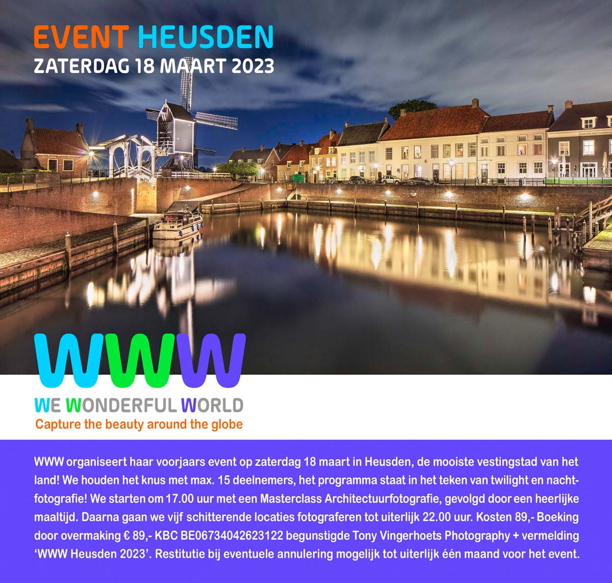 Niet voor niets koos ik daarom Heusden als locatie voor het eerste WWW Event in 2022. WWW staat voor We Wonderful World, een unieke Facebook Fotografiegroep (klik hier) met hoog kwaliteitsgehalte. Dit jaar wilde ik een herhaling maar dan met de focus op twilight- en nachtfotografie met minder deelnemers, omdat dat vraagt om meer concentratie. Want tijdens de eerste editie zag ik dat veel WWW-fotografen na afloop wachtten op zonsondergang om dan de fraaiste foto’s te maken.