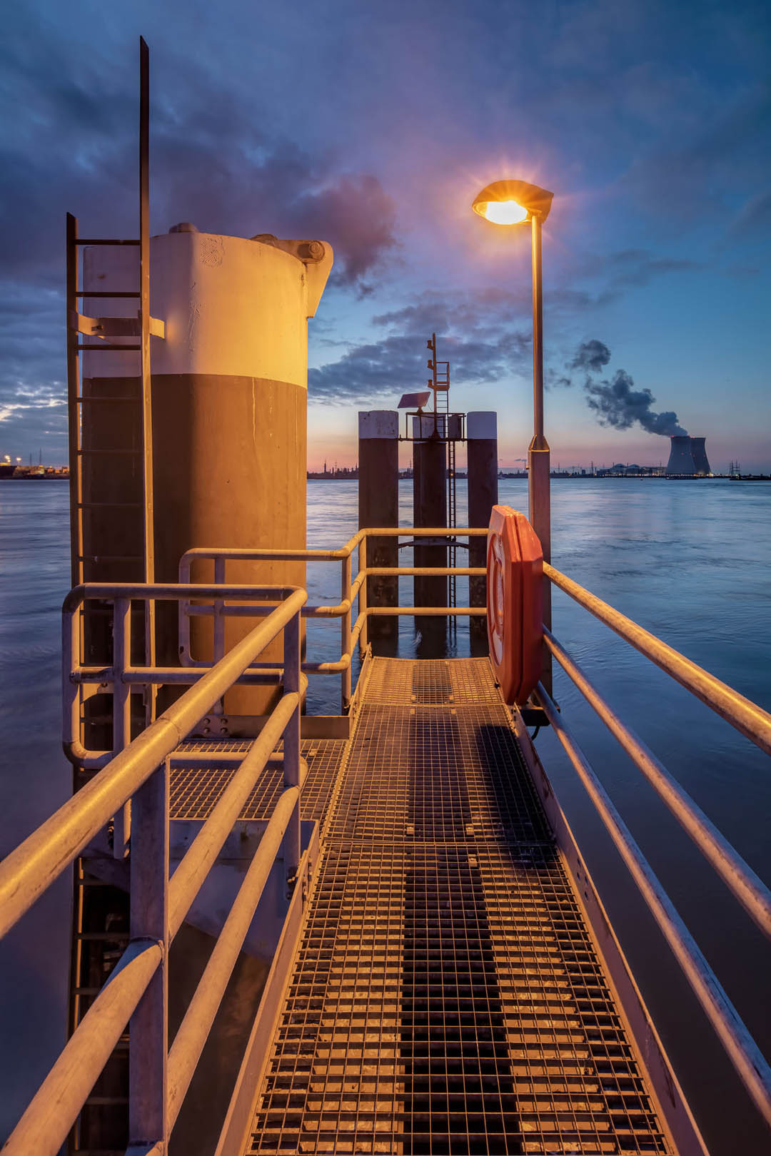 En eigenlijk is elk weertype interessant bij zo’n haven shoot. Zelfs tussen regenbuien door, wat voor meer verzadigde kleuren zorgt en ook een zachte glans op kades en wegen. Laten we niet vergeten dat je waterplassen ook prima kunt gebruiken voor reflecties. We starten steevast rond het blauwe halfuurtje op een lange pier de Schelde waar we zicht hebben op een van de grootste container terminals, maar ook op kerncentrale Doel. Maar ook de pier zelf is fotogeniek!