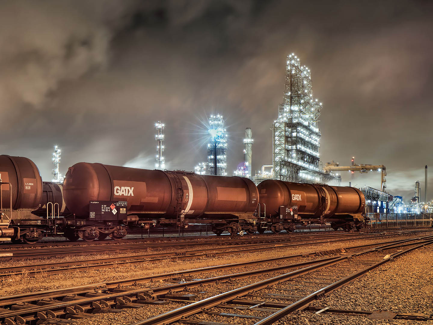 De vijfde locatie is mijn favoriet: een rangeerterrein met cilindervormige wagons (voor transport vloeibaar gas) met op de achtergrond de olieraffinaderij met de enorme toren die we daarvoor op grote afstand hebben gefotografeerd. Het is een scene waar je vanuit wel vijf of meer verschillende invalshoeken, uitstekende foto’s kunt maken. Ook de treinwagons zelf zijn dankbare objecten. We zijn alleen daar al zeker een half uur driftig aan het werk.