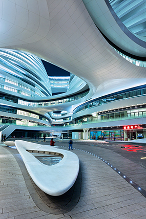 Het is SOHO China's eerste samenwerking met Zaha Hadid, een van 's-werelds top architectenbureaus gevestigd in London. Deze company met 400 werknemers is het levenswerk van de 63 jarige Irakese Zara Hadid. Haar creaties kenmerken zich door een intrigerend lijnenspel, ingeval van SOHO Galaxy welvend en vloeiend. Het is in mijn optiek een baanbrekende architectonische stijl die mogelijk wordt gemaakt door geavanceerde bouwtechnieken. Er is ondertussen een volgend SOHO Zaha Hadid project in Beijing in aanbouw maar daar kom ik later wellicht op terug.