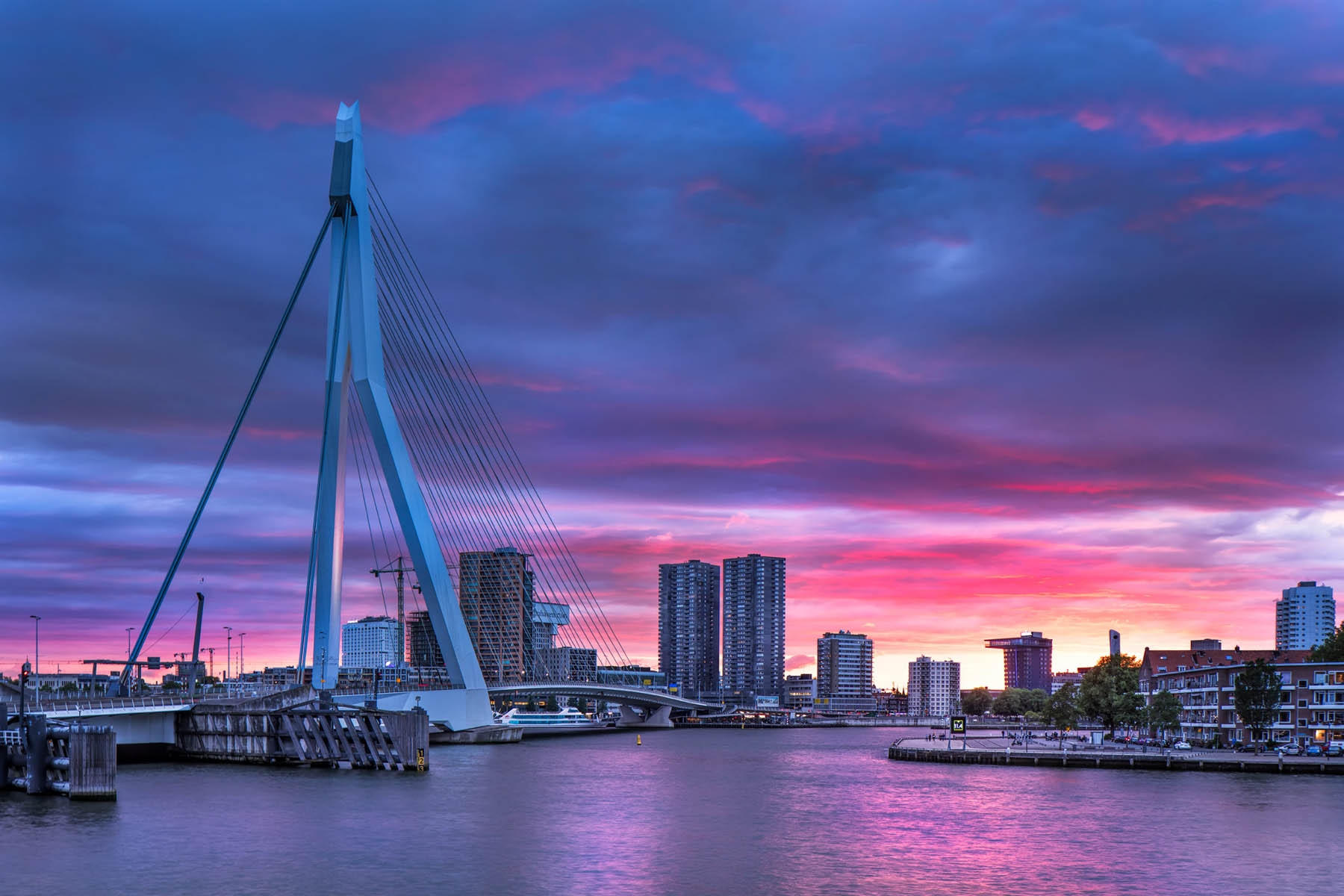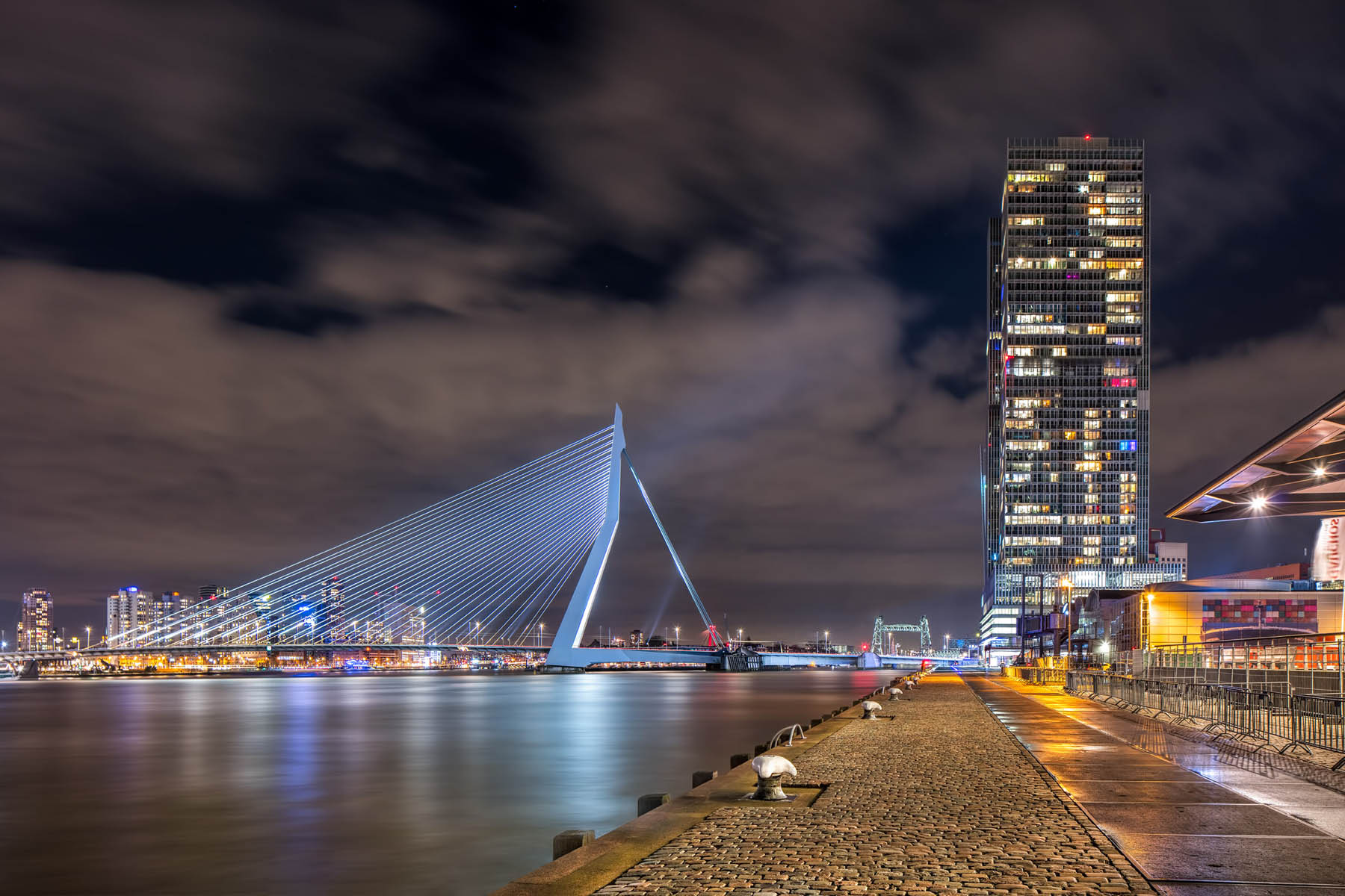 Enfin, ik heb een aantal foto’s uit mijn Kop van Zuid portfolio geselecteerd waar de Erasmusbrug de hoofdrol vertolkt. Ik hoop dat ze tot de verbeelding spreken en inspireren om de Rotterdamse icoon gewoon te blijven fotograferen. Het is eigenlijk een ideaal studieobject voor degenen die ambiëren architectuurfotograaf te worden. Probeer het binnen een tijdsbestek van een jaar op zoveel mogelijk manieren te fotograferen, telkens bij ander licht en weersomstandigheden.