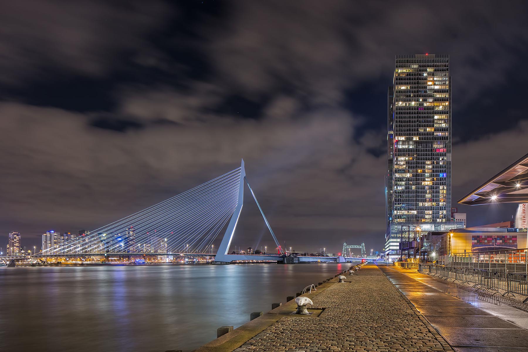 Eenmaal de Rijnhavenbrug overgestoken heb ik vanaf de Nico Koomanskade enkele series gemaakt van de Rijnhavenbrug met de Montevideo woontoren op de achtergrond. En een paar meters naar rechts verticale shifts met de Canon TS-E 24 f/3.5L mark II wat een vierkante cityscape is geworden. Wanneer je in zo’n geweldige flow zit, vergeet je gewoon de tijd. Het laatste shot van de Erasmusbrug maakte ik (op de terugweg naar de parking) om 23.55 uur, bij elkaar een vijf-urige shoot.