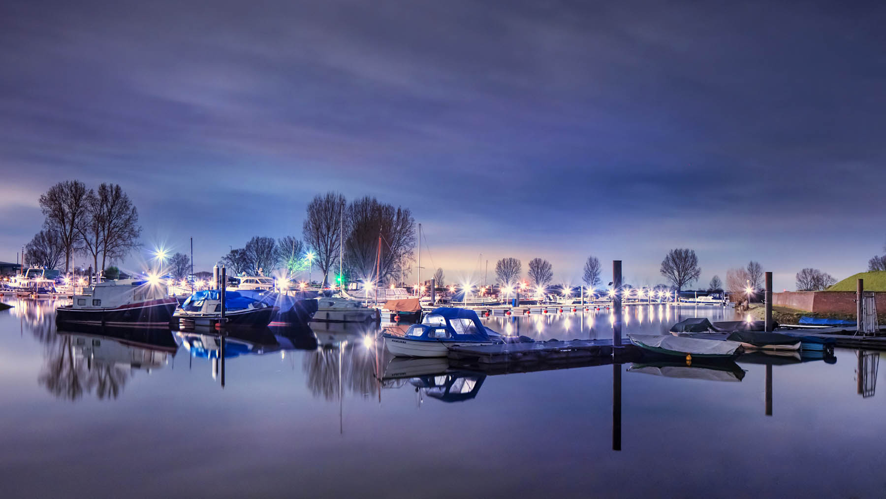 Vervolgens begaf de groep zich naar de Wijkse poort, de finale locatie. In het verleden had Heusden vier toegangspoorten, één in elke windrichting. Op een steenworp afstand van deze toegangspoort ligt de jachthaven, weliswaar in het duister gehuld. Tijdens mijn ‘generale repetitie’ (avond ervoor) had ik daar enkele series geschoten met de gedachte dat er waarschijnlijk weinig uit zou komen. En warempel verscheen er tijdens de editing toch een fantastische foto!