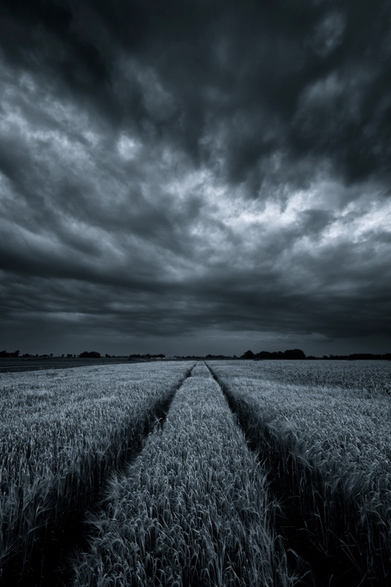 Het was een haastklus en ik had weinig tijd. Ben in mijn auto gesprongen en reed naar de velden net ten Noorden van Groningen. Ik was net op tijd om het laatste licht van de dag te vangen en getuige te zijn van enkele dramatische luchten. Flink wat onderbelichting om het geheel wat extra aan te dikken. Ik wist toen al dat het een zwart-wit plaatje moest worden, omdat het licht niet zo kleurrijk was die avond. In mijn haast was ik mijn Wellingtons vergeten dus toen ik klaar was had ik een paar schoenen aan die onder een verschrikkelijk plakkerige laag modder zaten die er nog steeds niet af is. Ik moest op mijn sokken naar huis rijden. Het had natuurlijk allemaal veel erger kunnen zijn. Er staan nog steeds een paar schoenen én Wellingtons van mij in de Waddenzee........te wachten om gevonden te worden!
