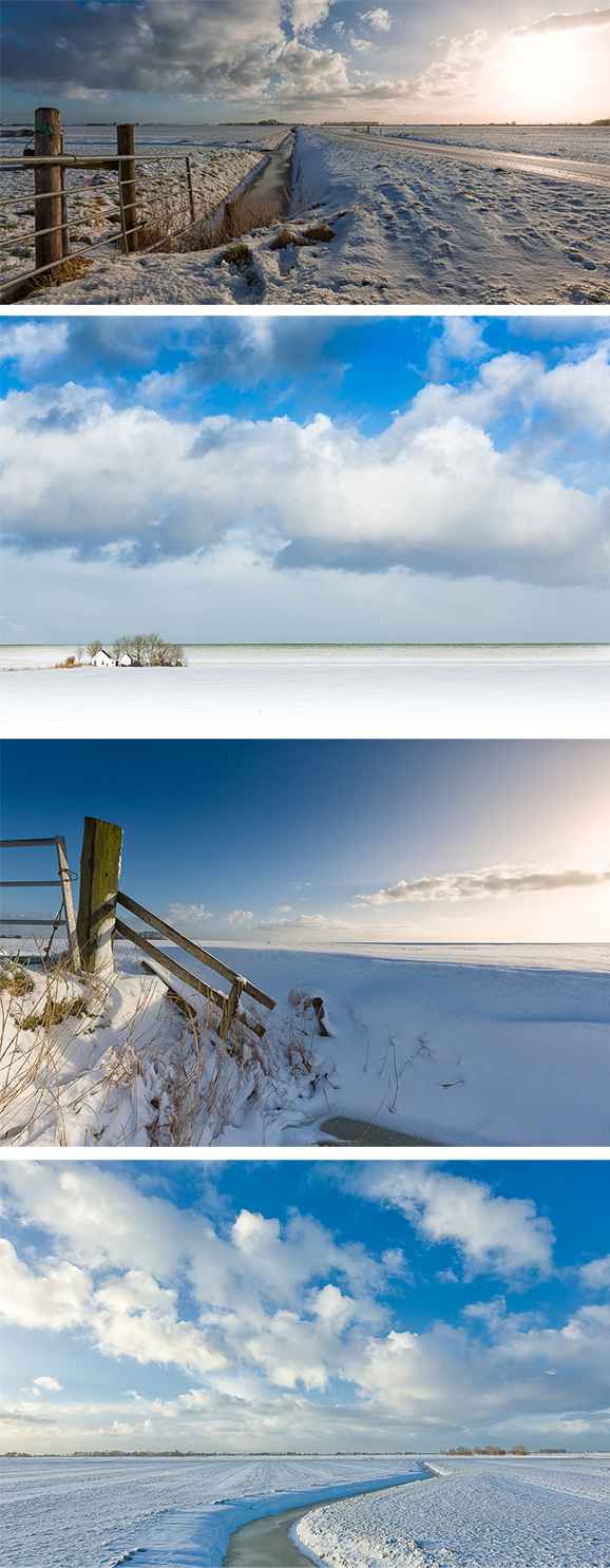 Sneeuw is voor een landschapsfotograaf een magisch iets. Het maakt van het saaiste landschap een prachtig schouwspel. Voeg daar wat geweldig licht aan toe en ik ben volmaakt gelukkig. Het grootste gedeelte van de dag heb ik rondgereden over het platteland van Groningen, van de ene locatie naar de andere, stoppen en schieten. Het is zwak uitgedrukt als ik zeg dat ik een mooie dag heb gehad. Fantastisch. Dagen als deze zijn een van de redenen dat ik een fulltime landschapsfotograaf ben geworden. Vroeg opstaan in de wetenschap dat je de hele dag op pad zult zijn. Geen verplichtingen, geen deadlines, geen papierwerk. Alleen met mijn camera, een kopje koffie en verder niets anders dan blauwe luchten, prachtige landschappen en geweldig licht. Ik heb slechtere dagen gehad!