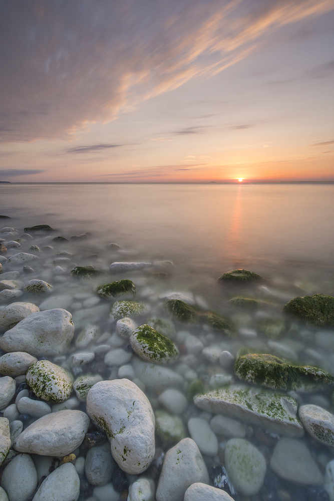 Tja, en dan sta je daar op het enige beschikbare weekend met hoog water tijdens een zonsondergang op een strook van 10 meter kiezelstenen terwijl je weet dat er zo’n 50 meter prachtig fotogeniek strand vóór je onder de wateroppervlakte ligt! Dan is het een mooie uitdaging het juiste standpunt te kiezen en om toch nog voorwerpen/stenen te zoeken die voor dieptewerking en dynamiek zorgen. Met mooie luchten kun je dan overigens veel compenseren. Maar ja; zaterdags was het bijna 30 graden en was de lucht knalblauw! Je loopt dan trouwens behoorlijk in de kijker als je met lange outdoorbroek, grote laarzen en een zware rugzak over het strand loopt terwijl iedereen lekker in z’n zwembroek of bikini daar zit te genieten van de zon.